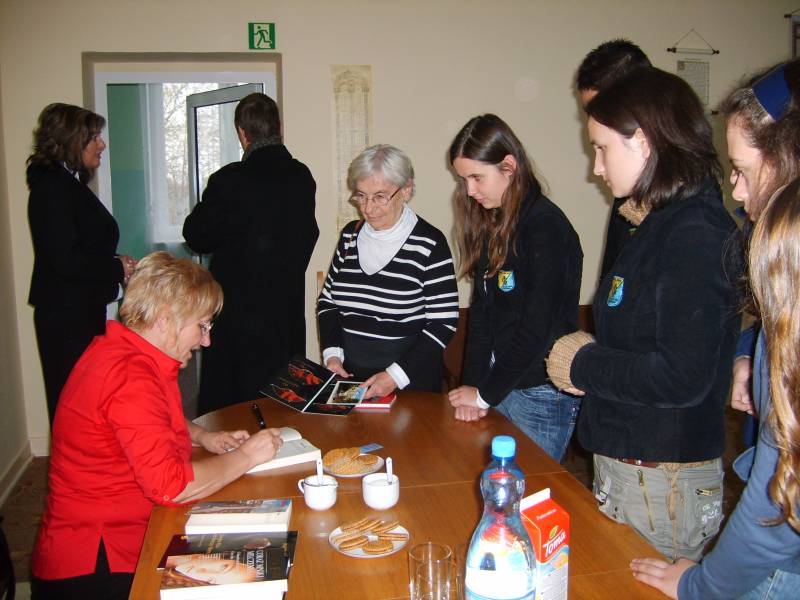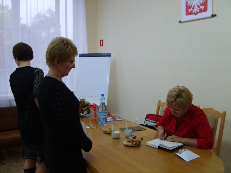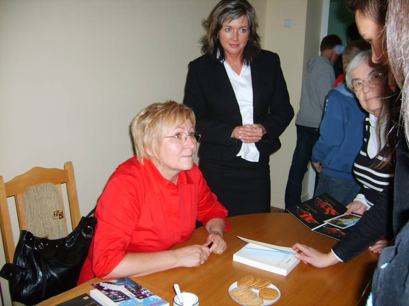 Książki Marty Fox cieszą się ogromnym powodzeniem w naszej bibliotece. Posiadamy wszystkie (22) tytuły. W swoich książkach pisarka porusza problemy dzieci i młodzieży, dojrzewanie emocjonalne, pierwsze miłości, zaburzone związki między dorosłymi opiekunami i ich dziećmi bądź wychowankami, próbuje ukazać nowoczesny, partnerski model rodziny. O tych właśnie problemach młodzież dyskutowała z psiarką. Spotkanie autorskie z Martą Fox to doskonała lekcja życia dla młodych ludzi. Na zakończenie można było zakupić książki wraz z dedykacją autora.