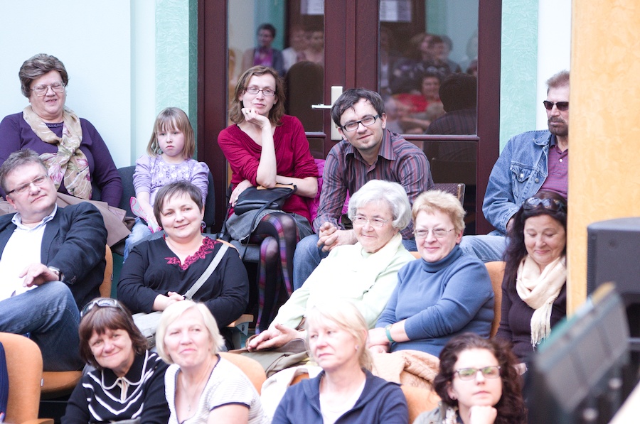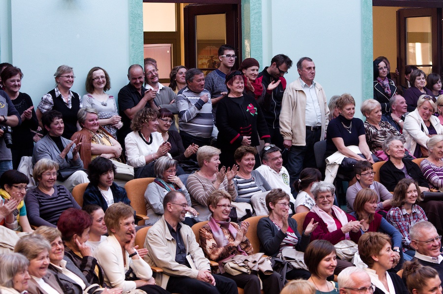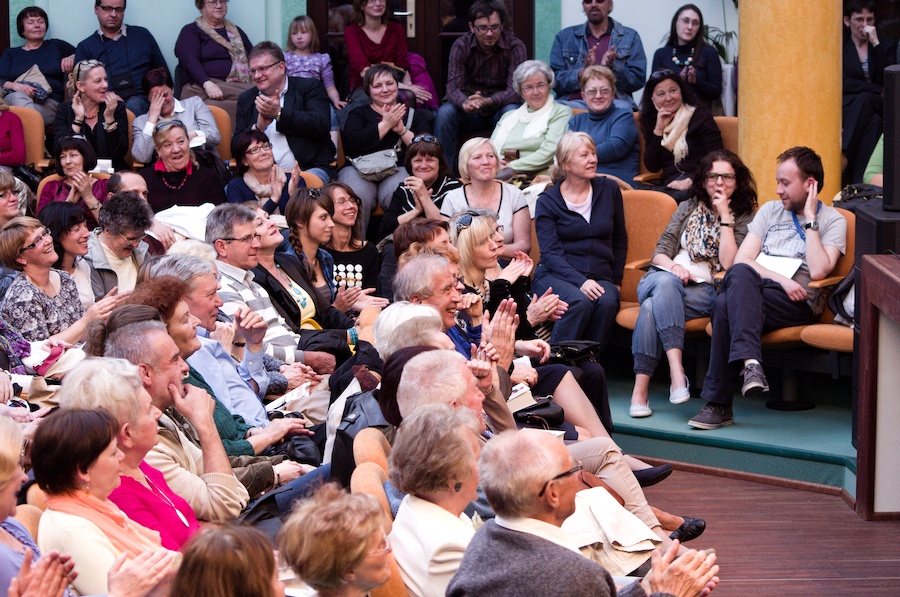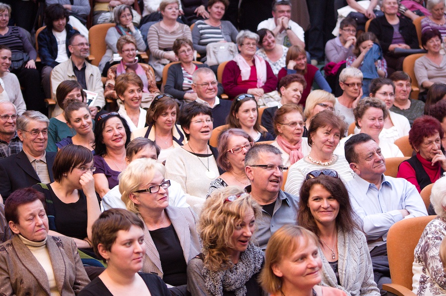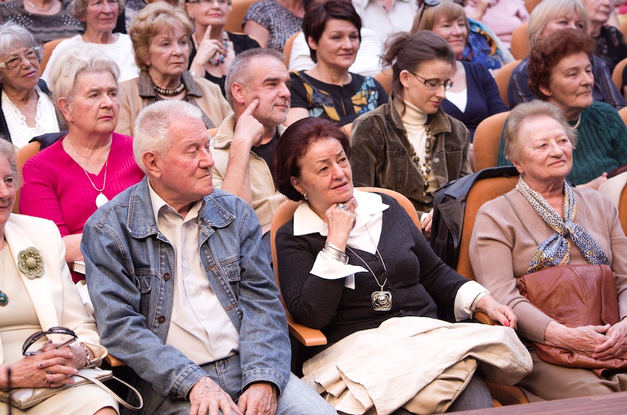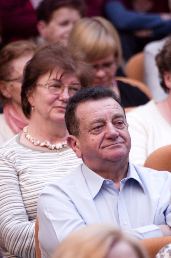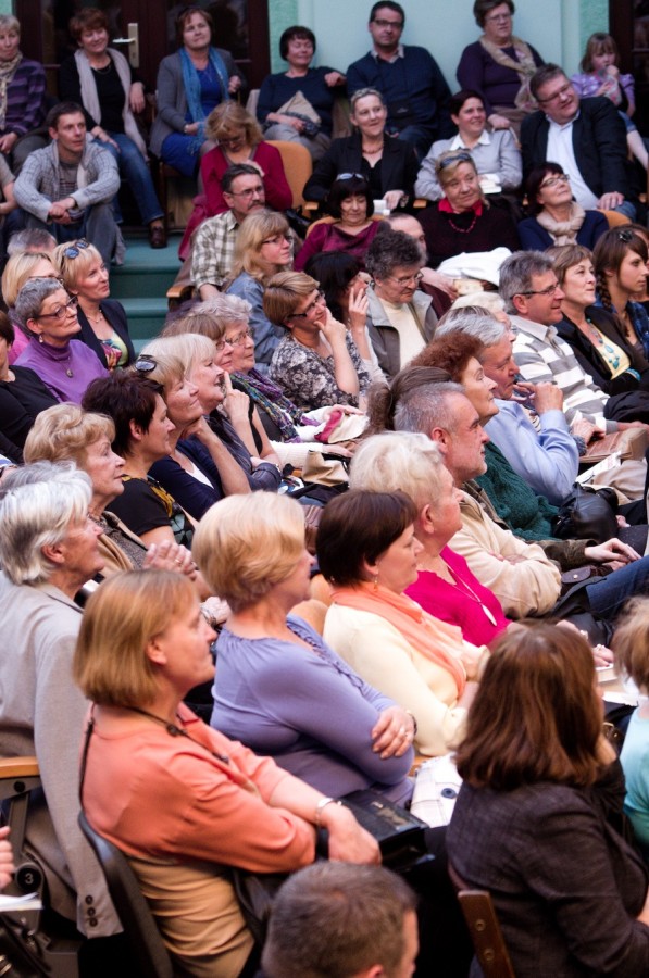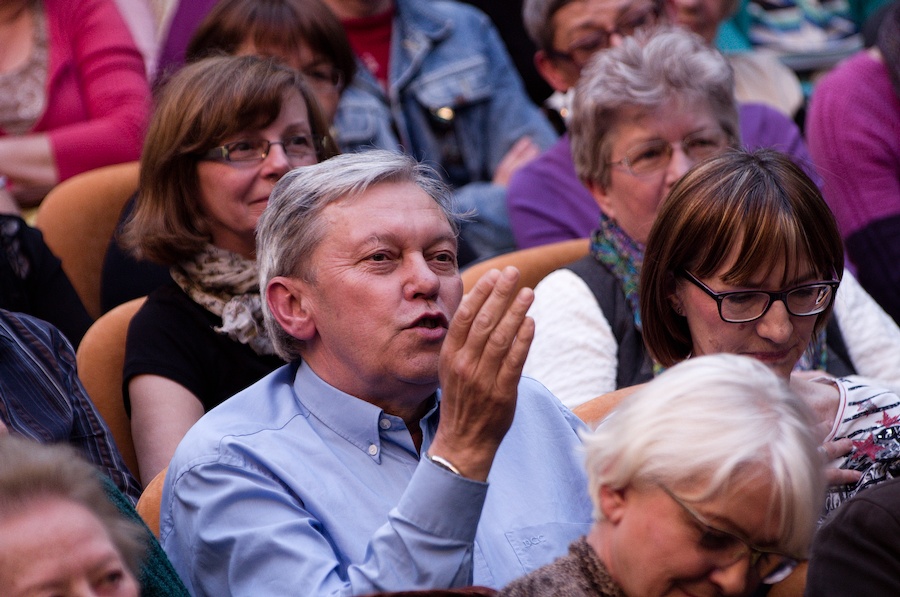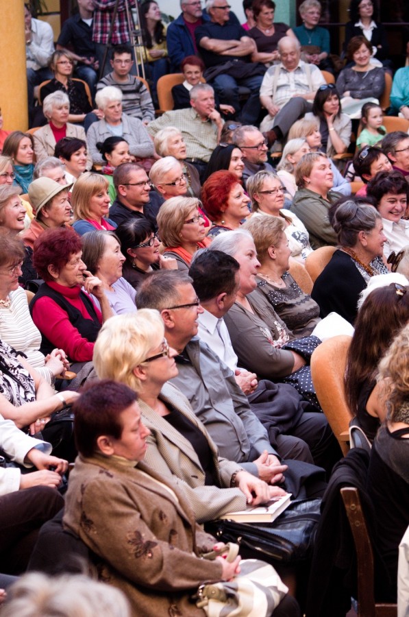 Oboje z ogromnym poczuciem humoru i dystansem do siebie i do świata, poruszali różne tematy, od starości, zmarszczek , „nienachalnej urody” i dojrzałości pani Marii, przez jej podróże, aż po tematy sportowe m.in. związane z EURO 2012 (nawiasem mówiąc pani Maria została „fanką-kibicem” drużyny Korona Kielce). Jednym słowem – mnóstwo anegdot, dużo błyskotliwego humoru, salwy śmiechu i gromkie brawa, tak wyglądało spotkanie autorskie z Marią Czubaszek i Arturem Andrusem, na które przybyło około 370 osób