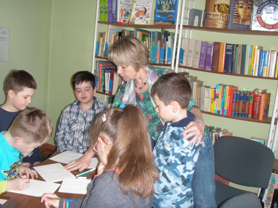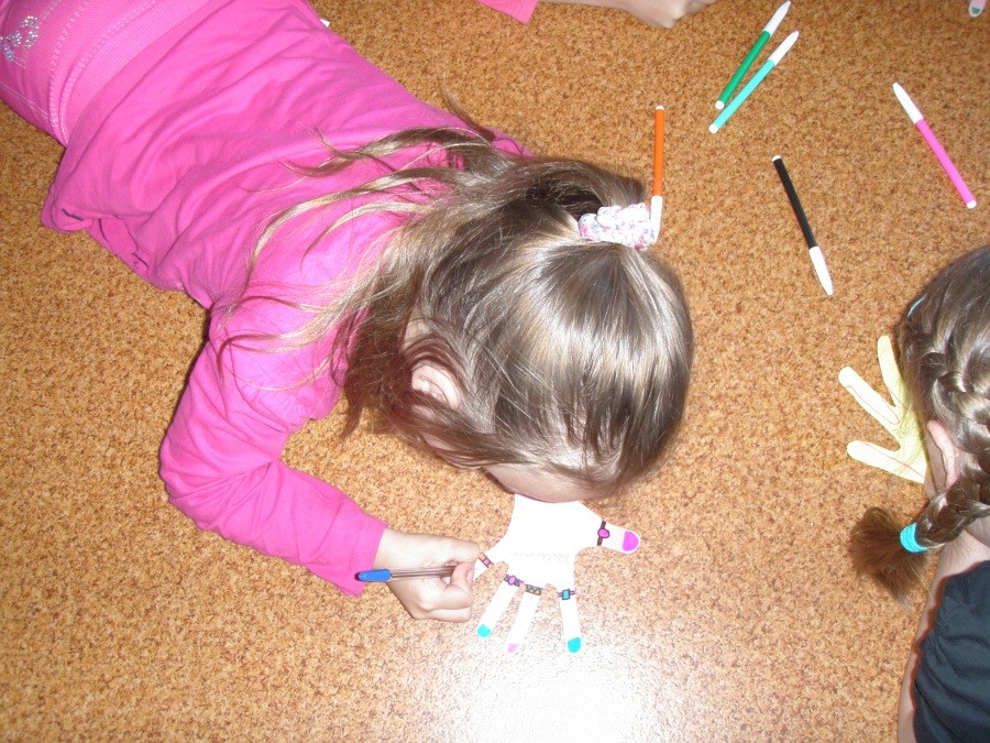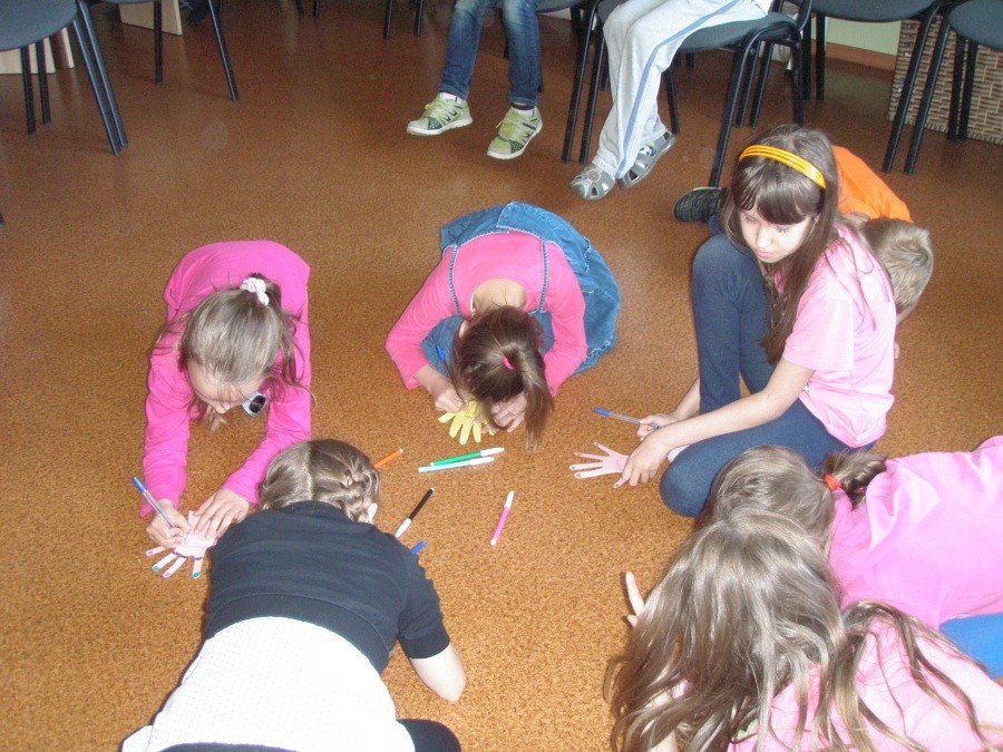 Dzieci chętnie wzięły udział w zabawach sprawdzających znajomość baśni i opowiadań dla dzieci. Wykonywały mapy pamięci na odrysowanej na kartonie swojej dłoni. Dla niektórych naszych gości była to pierwsza wizyta w bibliotece. Na zakończenie wszyscy dostali zakładki do książki.
