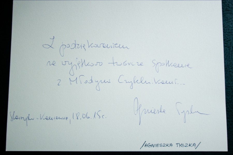 Na zakończenie spotkania, dzieci na zakładkach i zakupionych egzemplarzach książek pani Agnieszki, otrzymały wpis wraz z jej autografem.