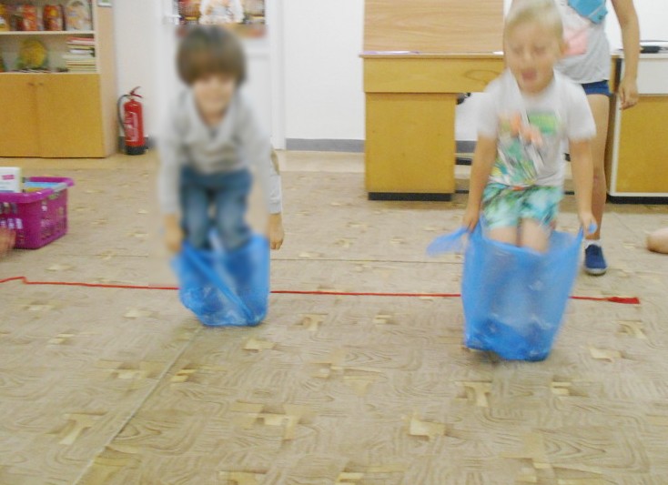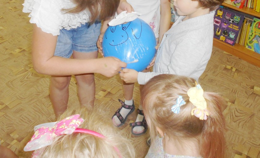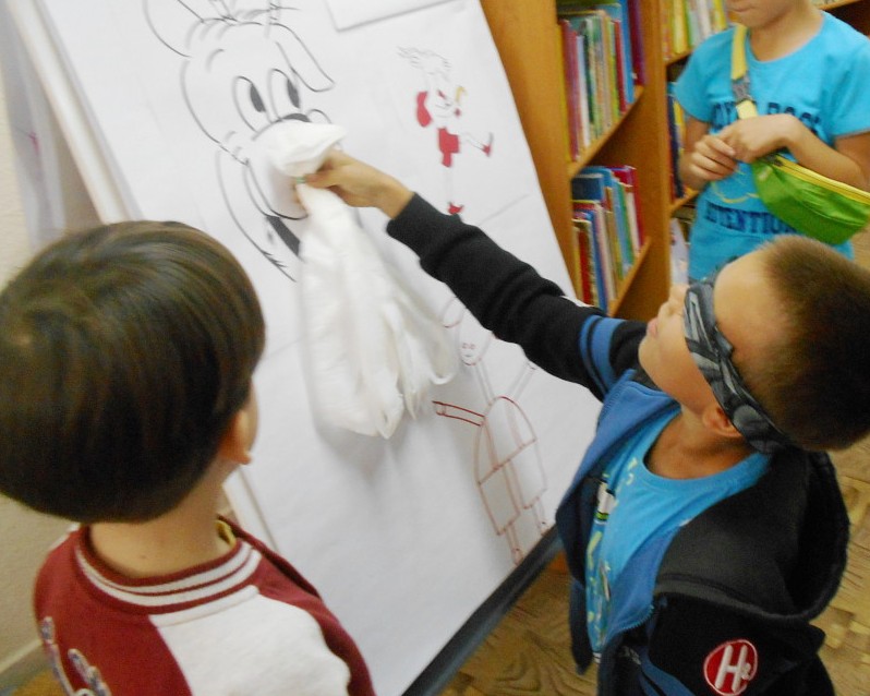 „RYMUJEMY Z KOZIOŁKIEM”– muzyczne gry i zabawy odbywające się w Oddziale dziecięcym Filii nr 2 w każdą środę. Dzieci na tych zajęciach rysują portret koziołka mając przewiązane chustą oczy. Podejmują próby golenia i doczepienia brody koziołkowi oraz naśladują brykania z koziołkiem i skoki przez przeszkody.