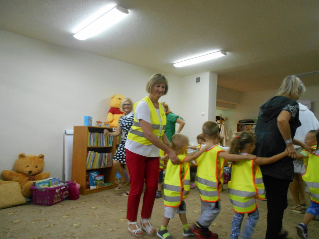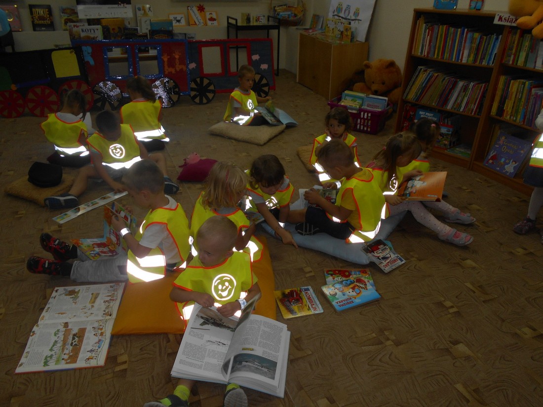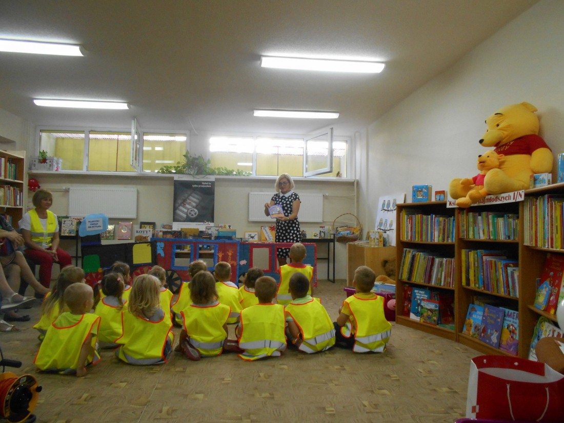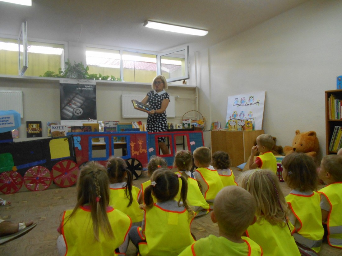 Podczas zajęć dzieci również zwiedziły bibliotekę, zapoznały się z zasadami wypożyczania książek, wysłuchały opowieści o Kici Koci w pociągu autorstwa Anity Głowińskiej czytanej przez bibliotekarza. Zajęcia były urozmaicone zabawami ruchowymi.