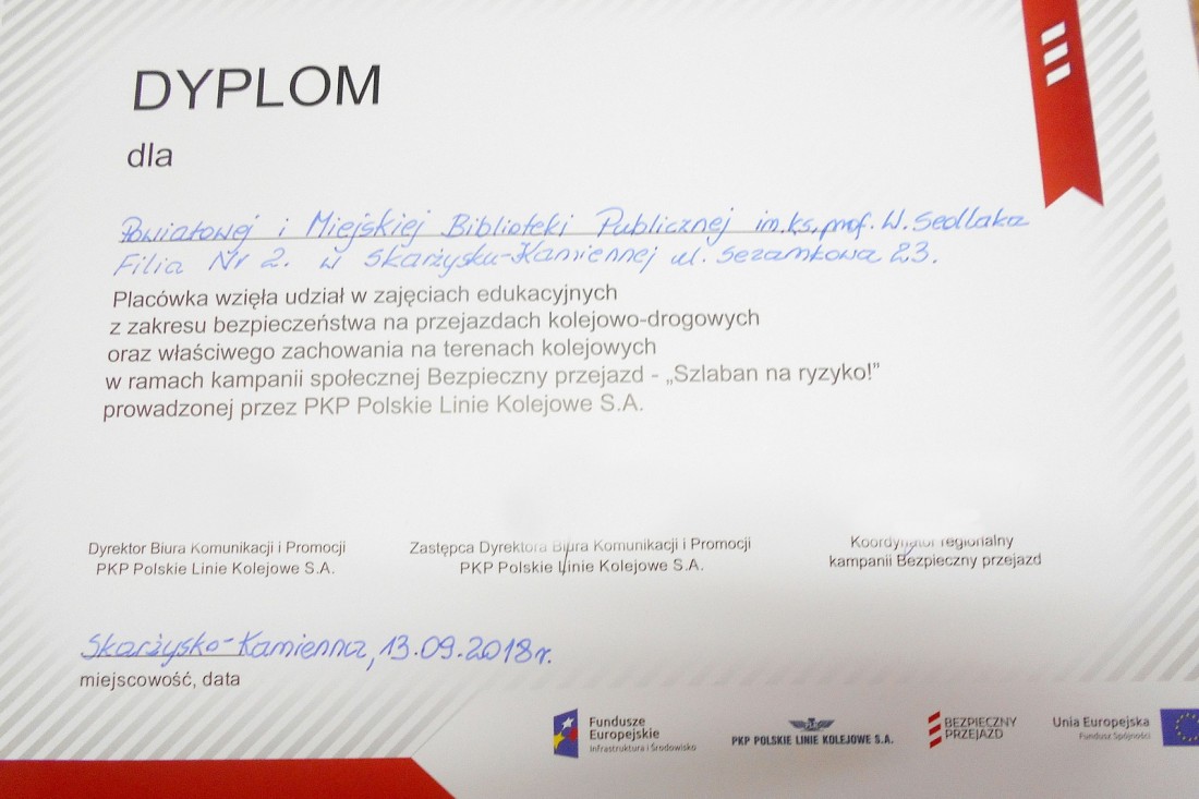 13 i 20 września 2018 roku w Oddziale dziecięcym Filii nr 2 przy ulicy Sezamkowej odbyły się dwa spotkania dzieci z Przedszkola nr 10 oraz z Przedszkola nr 6 z panią, która jest koordynatorem regionalnym kampanii społecznej Bezpieczny przejazd – „Szlaban na ryzyko!” prowadzonej przez PKP Polskie Linie Kolejowe S.A.