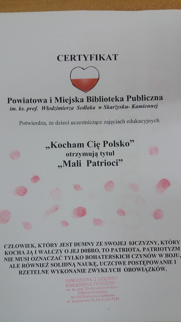 8 listopada 2018 r. w Oddziale dziecięcym przy ul. Sezamkowej obyło się spotkanie pt.: „Kocham Cię Polsko”. Uczniowie z klasy I Szkoły Podstawowej Nr 13 w Skarżysku Kamiennej wzięli udział w zajęciach edukacyjnych przygotowanych z okazji 100-lecia odzyskania niepodległości przez Polskę. Bibliotekarka zapraszając w podróż po mapie Polski, przybliżyła dzieciom symbole narodowe i historie ich powstania, a także polskie miasta, krajobrazy, pomniki i budowle upamiętniające wybitnych Polaków znajdujące się w kraju nad Wisłą.