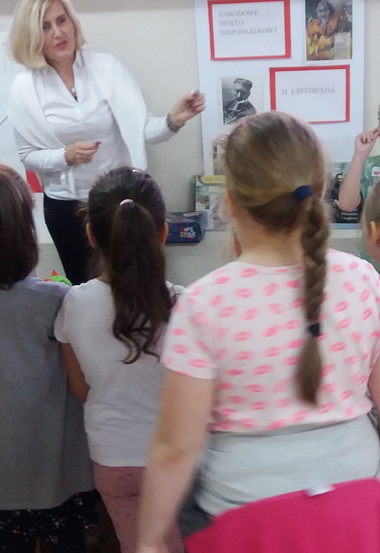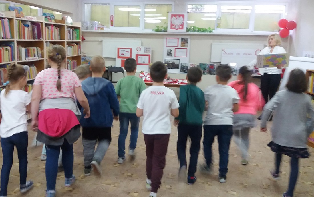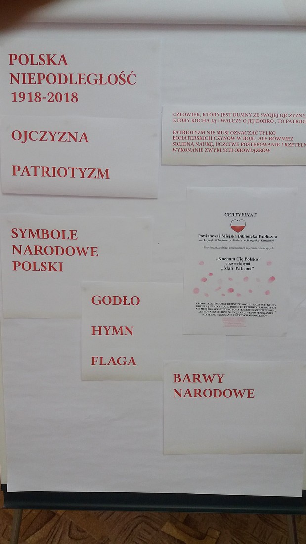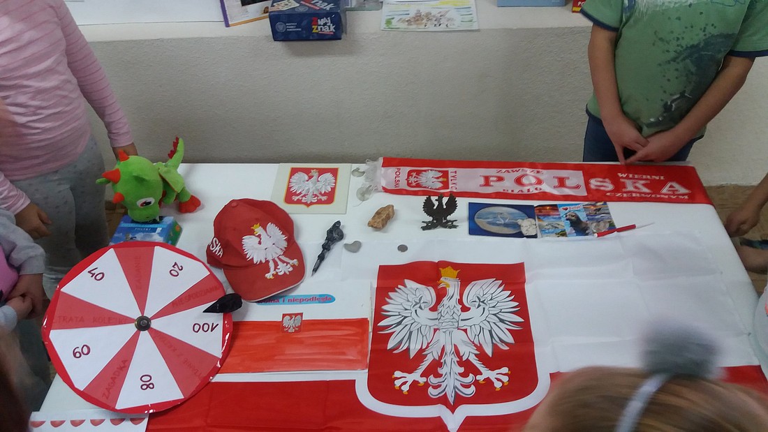 Spotkanie inspirowane było zbiorem wierszy patriotycznych autorstwa Anny Paszkiewicz „Polak mały” oraz zabawą w Koło fortuny, które pogłębiły wiedzę u dzieci na temat ojczyzny. Zajęcia urozmaicone były piosenką „Jesteśmy Polką i Polakiem” podczas której, uczniowie otrzymali pamiątkowe serduszka w narodowych barwach..