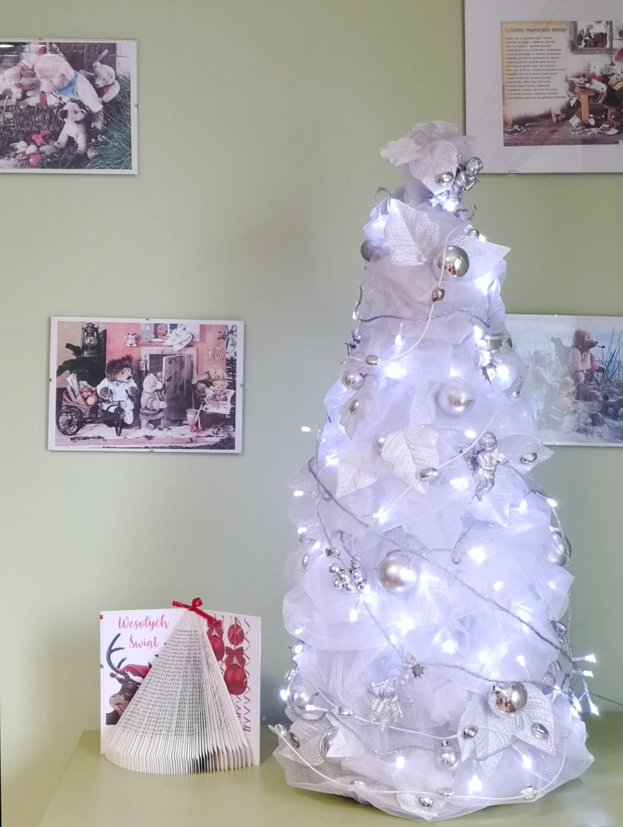 Z bibliotecznych magazynów wyłoniły się również liczne eko choinki, które wdzięcznie zdobią pozostałe pomieszczenia instytucji. W taki oto sposób, trochę na przekór świątecznym schematom, stare książki zyskały drugie życie i zdobią Wypożyczalnię dla dorosłych czy Oddział dziecięcy.