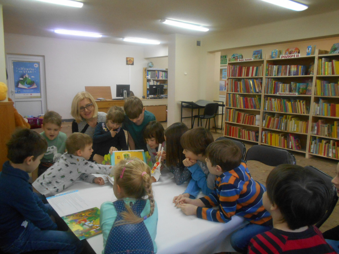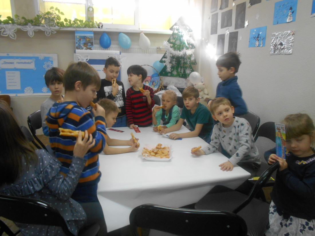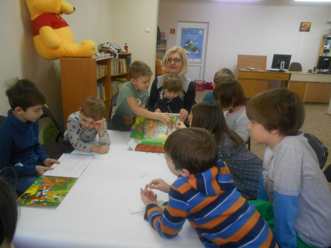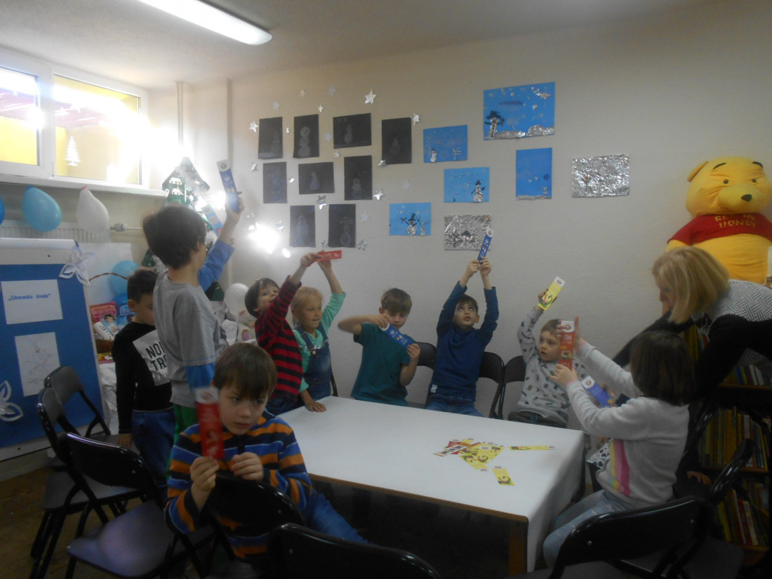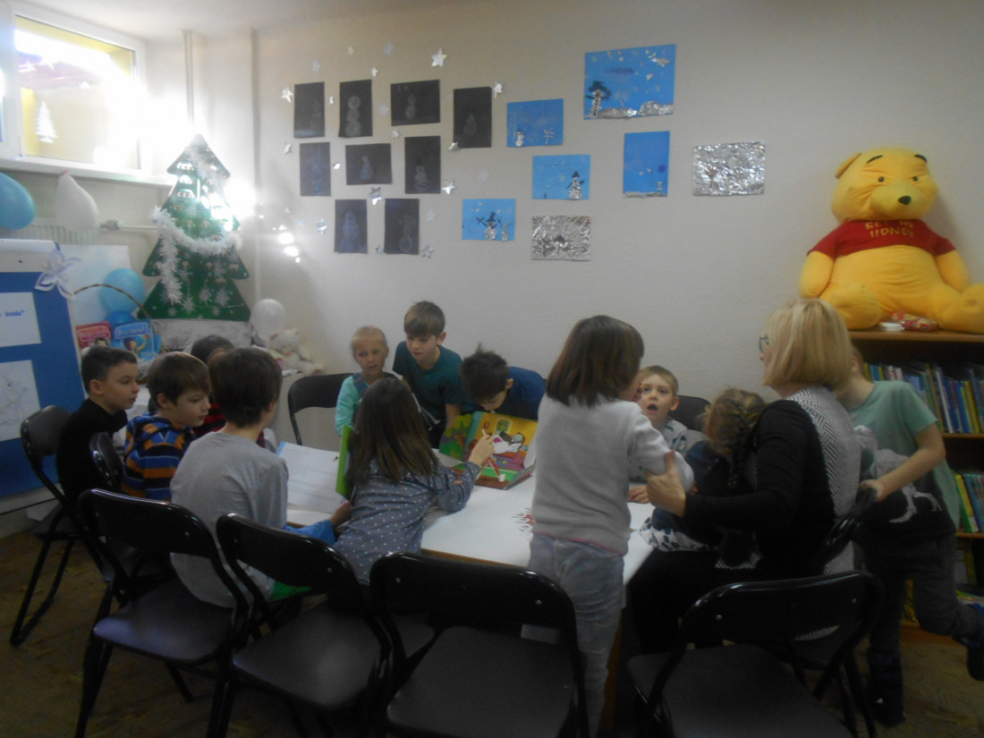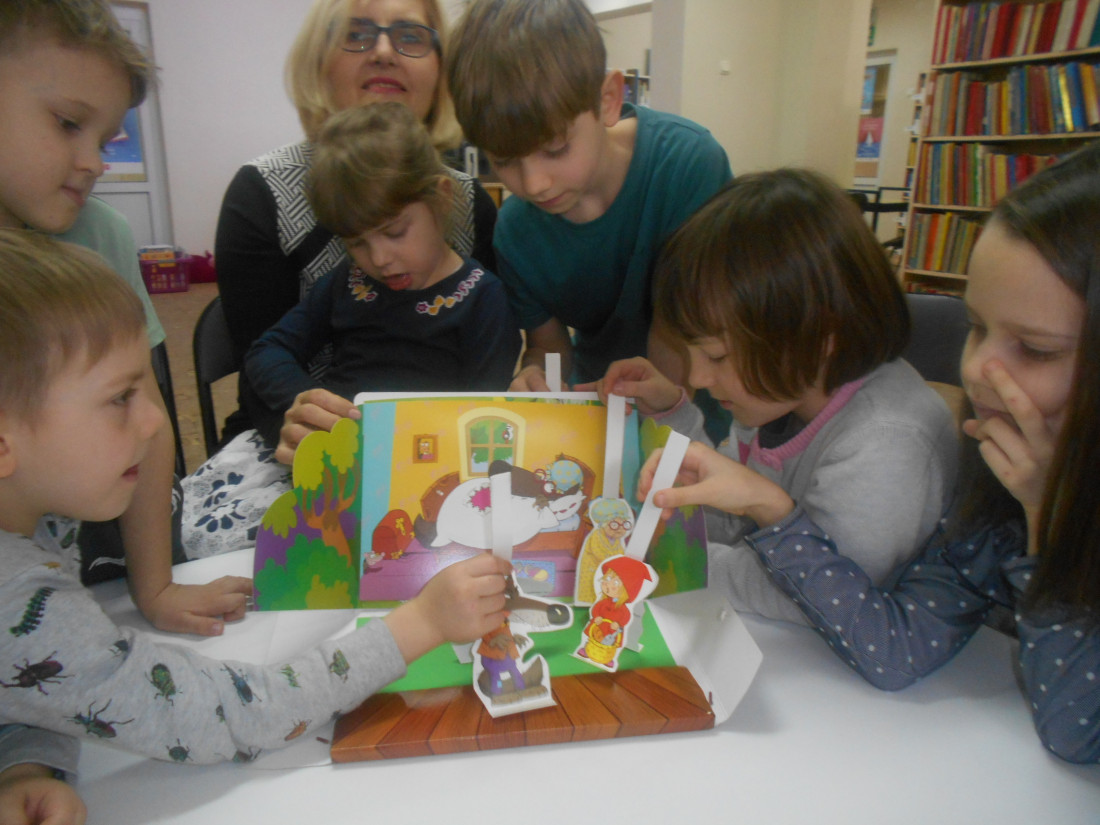 Drugi tydzień ferii w Oddziale dziecięcym przy ulicy Sezamkowej rozpoczęliśmy od zgaduj-zgaduli, na dzieci czekały baśniowe zgadywanki. Podczas zajęć plastycznych malowały na podkładzie z folii aluminiowej farbą plakatową tworząc zimową galerię prac plastycznych. Natomiast bałwanek ulepiony w magicznej kuli ze słoika powędrował z dziećmi do domu. Dzieci bawiły się w teatr poznając jego ważne funkcje, wcielały się w role, odgrywając różne scenki z bajki o Czerwonym Kapturku, z ciekawością uczestniczyły w zabawie kalambury w formie pantomimy.