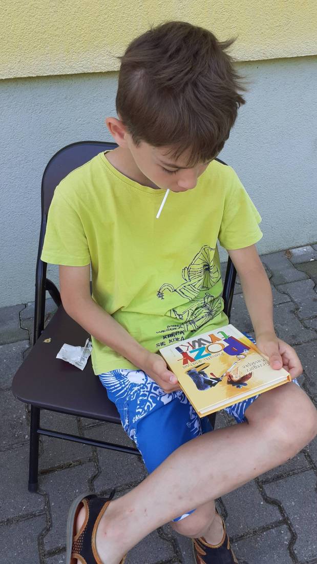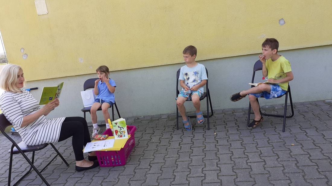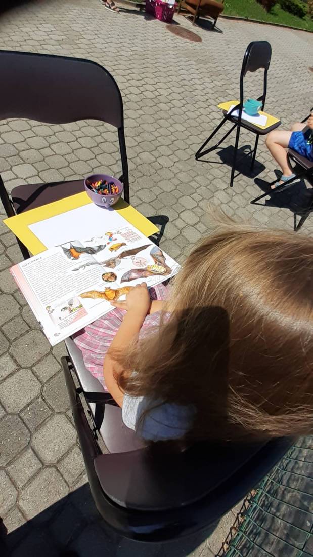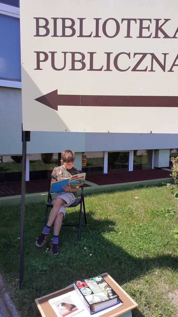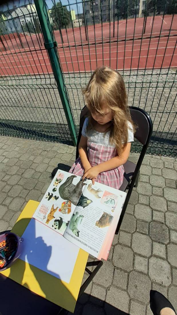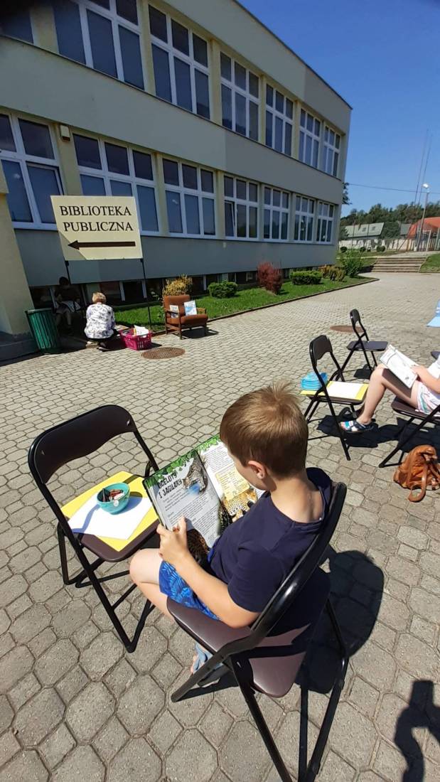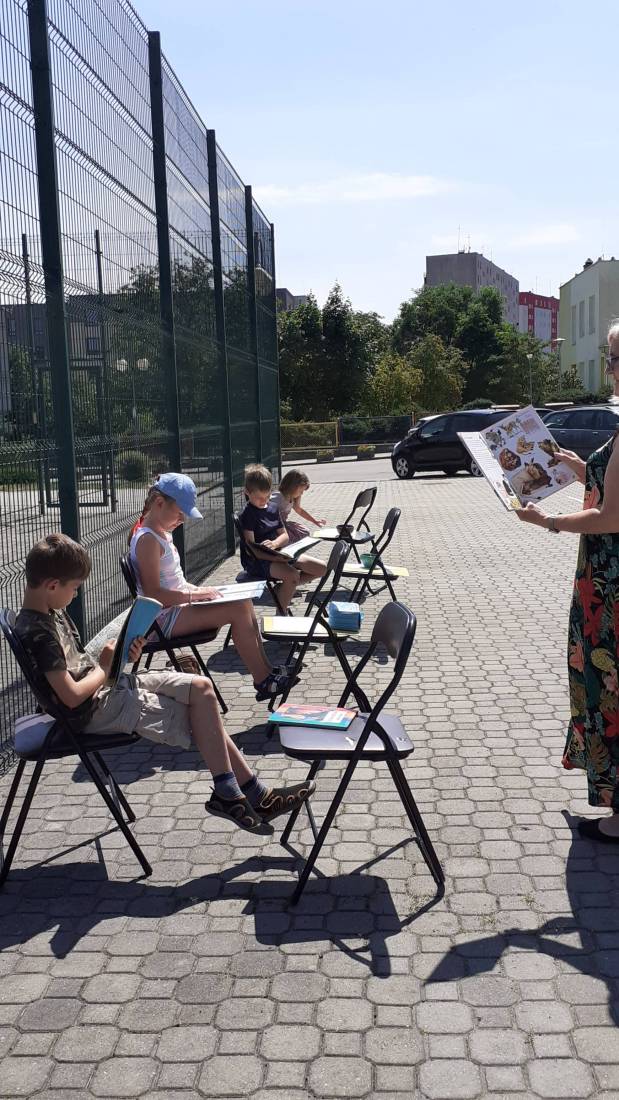 Wakacje w bibliotece dziecięcej przy ul. Sezamkowej ze względu na czas pandemii oraz nowe zasady funkcjonowania Biblioteki, odbywały się w plenerze i z ograniczoną liczbą uczestników.