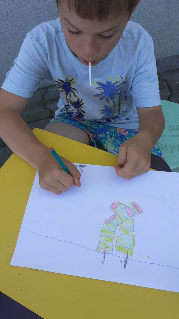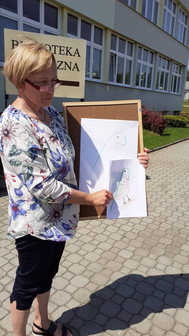 Natomiast podczas zajęć plastycznych, ich uczestnicy wykonywali ilustracje do książek. Rysunki ulubionych bohaterów stworzyły następnie wystawę prac dzieci – Galeria na sznurku. Można ją zobaczyć odwiedzając bibliotekę.