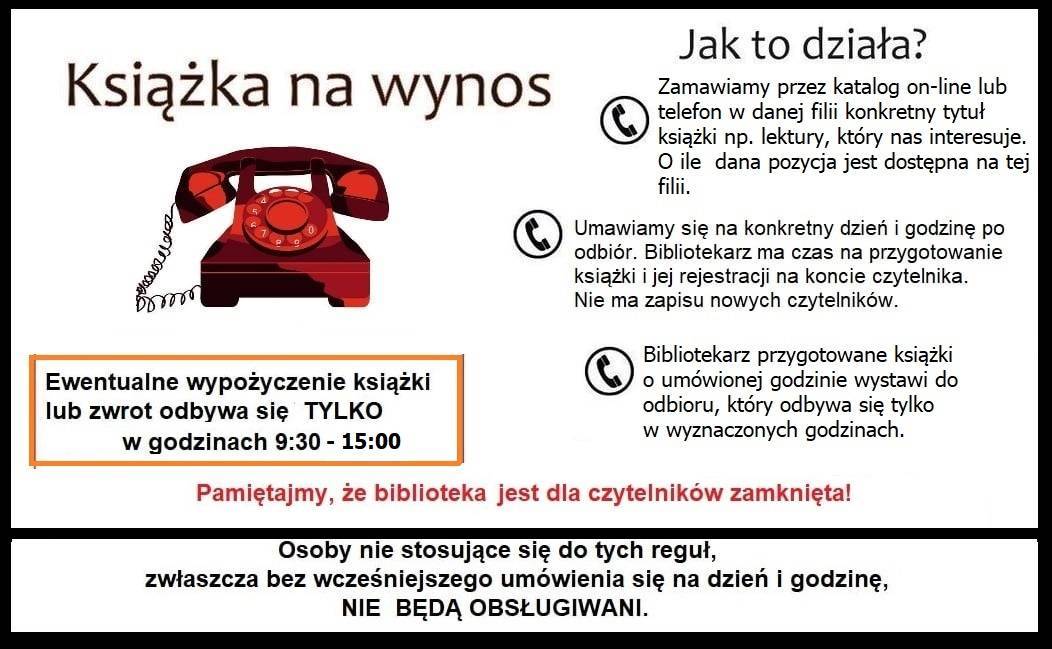 Biblioteka jest czynna, ale funkcjonuje w ograniczonym czasie i zakresie. Zamówienia na konkretne tytuły można składać poprzez Katalog on-line (system biblioteczny) lub telefonicznie w Filii do której jest zapisany Czytelnik. Realizacja wypożyczeń obywa się po wcześniejszym uzgodnieniu dnia i godziny odbioru lub zwrotu książek (bez kontaktu bezpośredniego z bibliotekarzem).