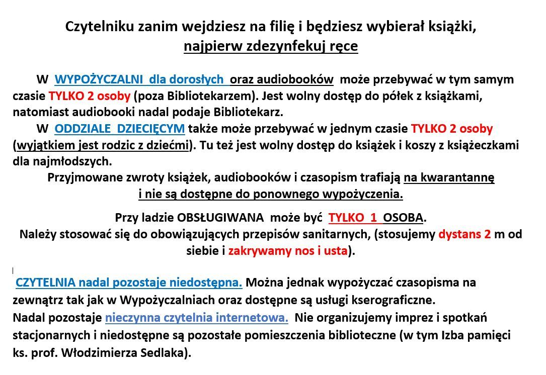 W WYPOŻYCZALNI dla dorosłych oraz audiobooków może przebywać w tym samym czasie TYLKO 2 osoby (poza Bibliotekarzem). Jest wolny dostęp do półek z książkami, natomiast audiobooki nadal podaje Bibliotekarz.