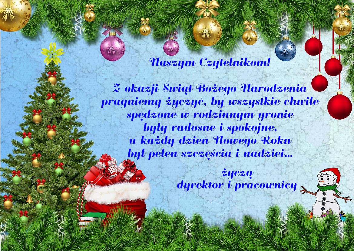 Życzenia świąteczne Post published:22 grudnia 2023 Post category:Komunikaty Naszym Czytelnikom! Z okazji Świąt Bożego Narodzenia pragniemy życzyć, by wszystkie chwile spędzone w rodzinnym gronie były radosne i spokojne, a każdy dzień Nowego Roku był pełen szczęścia i nadziei… życzą dyrektor i pracownicy Read more articles Previous Post„Skarby Biblioteki Narodowej” – komunikat Następny wpisDom obok | Klaudia Muniak
