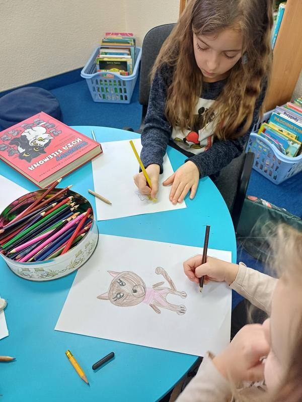 Dla dzieci przygotowano mini-wystawkę kocich książeczek, były też ciekawostki o kotach i kocie zagadki. Czytane były fragmenty książki „Przygody kota Filemona” oraz wiersze o kotach. Dzieci opowiadały też o swoich pupilach i ich przyzwyczajeniach. W ramach zajęć plastycznych uczestnicy spotkania wykonywali portret kota oraz Kotka Psotka z tektury.