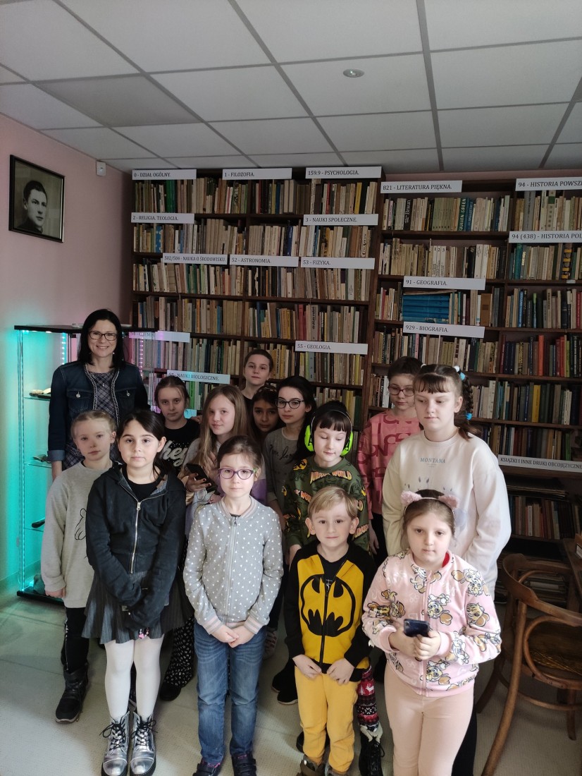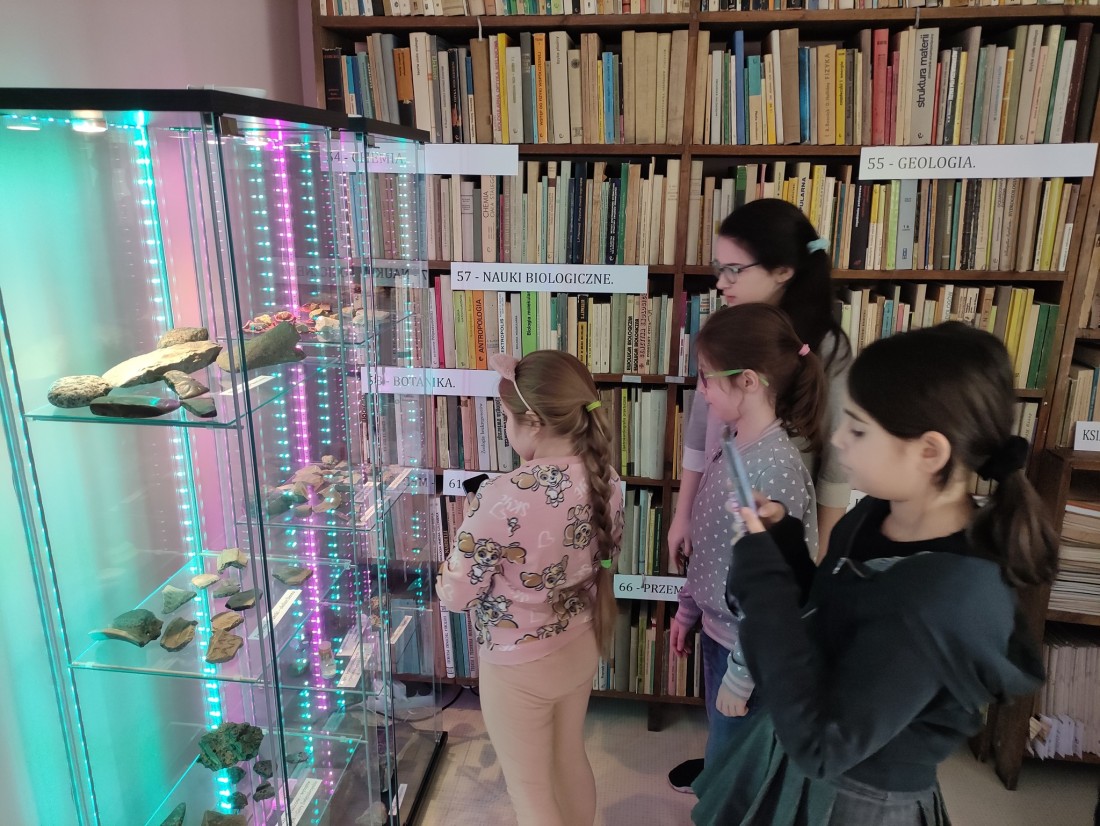 Dzieci zwiedziły również Izbę Pamięci mieszczącą się w bibliotece. Z zaciekawieniem oglądały znaleziska geologiczne z Łysogór, które umieszczone są w specjalnych gablotach. Niemałe wrażenie zrobiły na nich odciski meduz z Łysej Góry czy kryształy górskie i ametysty z Łysicy. Wiele emocji wzbudziły także pradawne narzędzia takie jak tłuki i topór kamienny.
