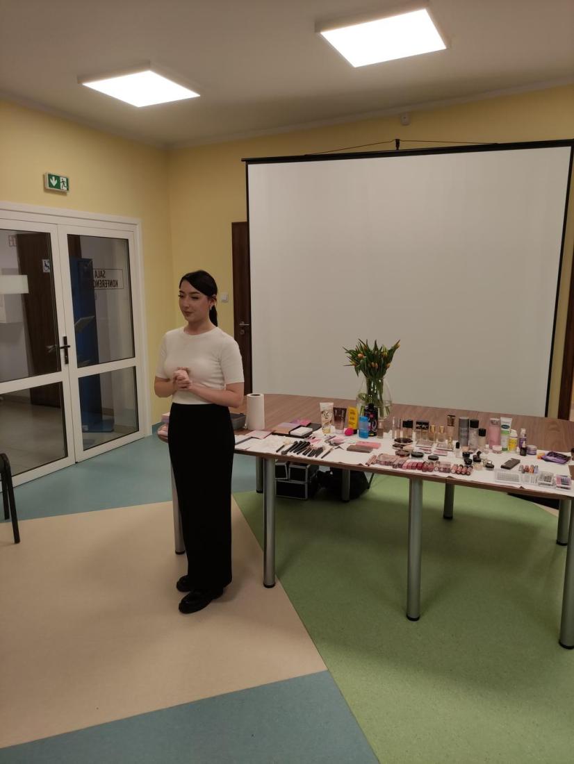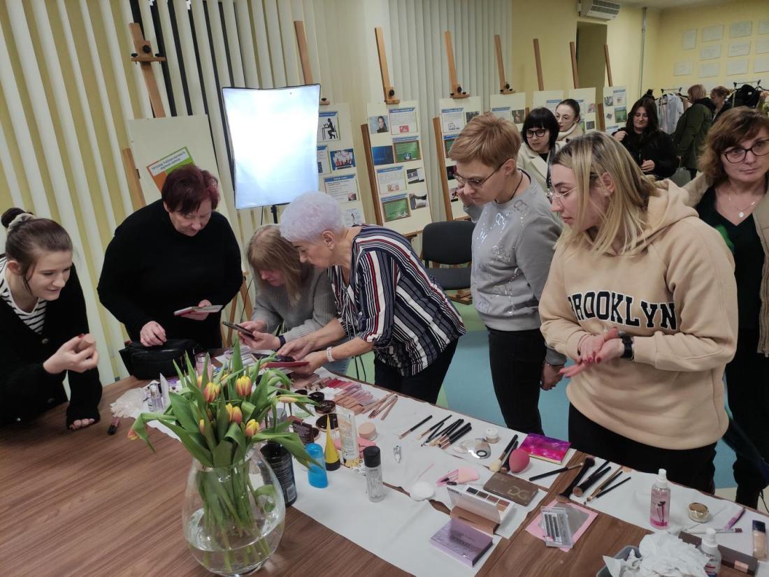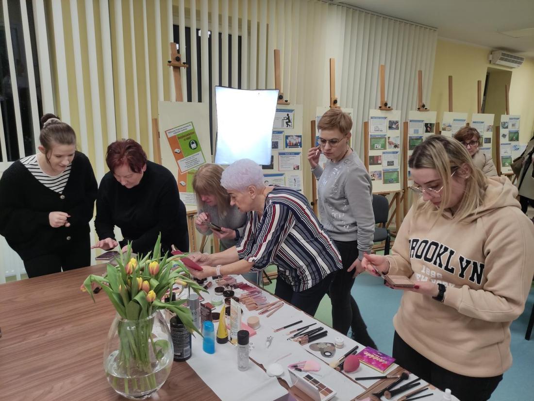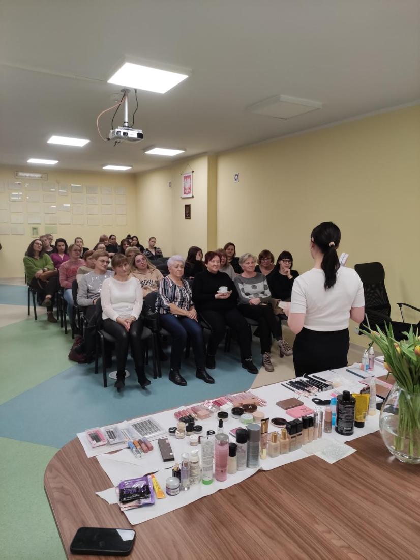 16 lutego 2024r., w Filii nr 1 odbyło się wyjątkowe spotkanie dla kobiet – „Zimowa szkoła makijażu”. Profesjonalna makijażystka p. Alicja Ołownia w bardzo szczegółowy sposób opisała licznie przybyłym Paniom metody pielęgnacji twarzy i ciała oraz pokazała, jakich kosmetyków warto używać, aby dbać o cerę i cieszyć się jej zdrowym i pięknym wyglądem. Spośród Pań wybrana została ochotniczka (modelka), której to wykonano profesjonalny makijaż, tłumacząc krok po kroku, w jaki sposób nakładać poszczególne kosmetyki i jakich używać przyrządów. Pani Alicja udzieliła cennych porad, jak dobierać makijaż adekwatny do wieku, typu urody oraz okazji. Uczestniczki szkolenia były bardzo zainteresowane tematem i dociekliwe – zadawały mnóstwo pytań, na które prowadząca udzielała wyczerpujących odpowiedzi. Panie miały również możliwość obejrzenia i wypróbowania polecanych kosmetyków do make-upu i pielęgnacji, z czego chętnie skorzystały.