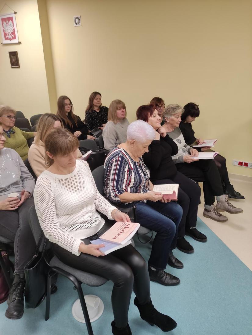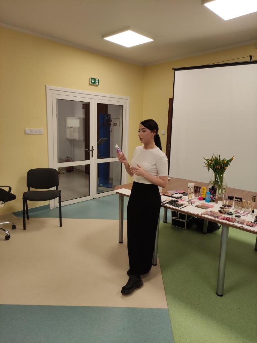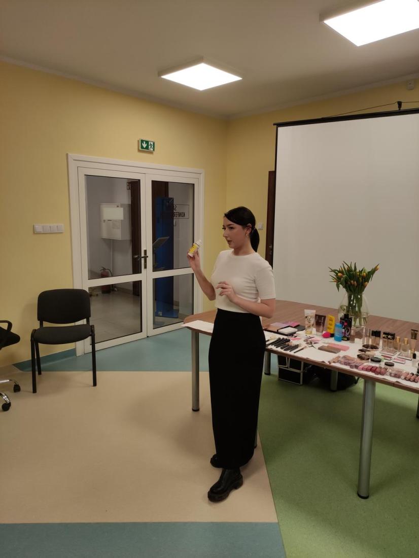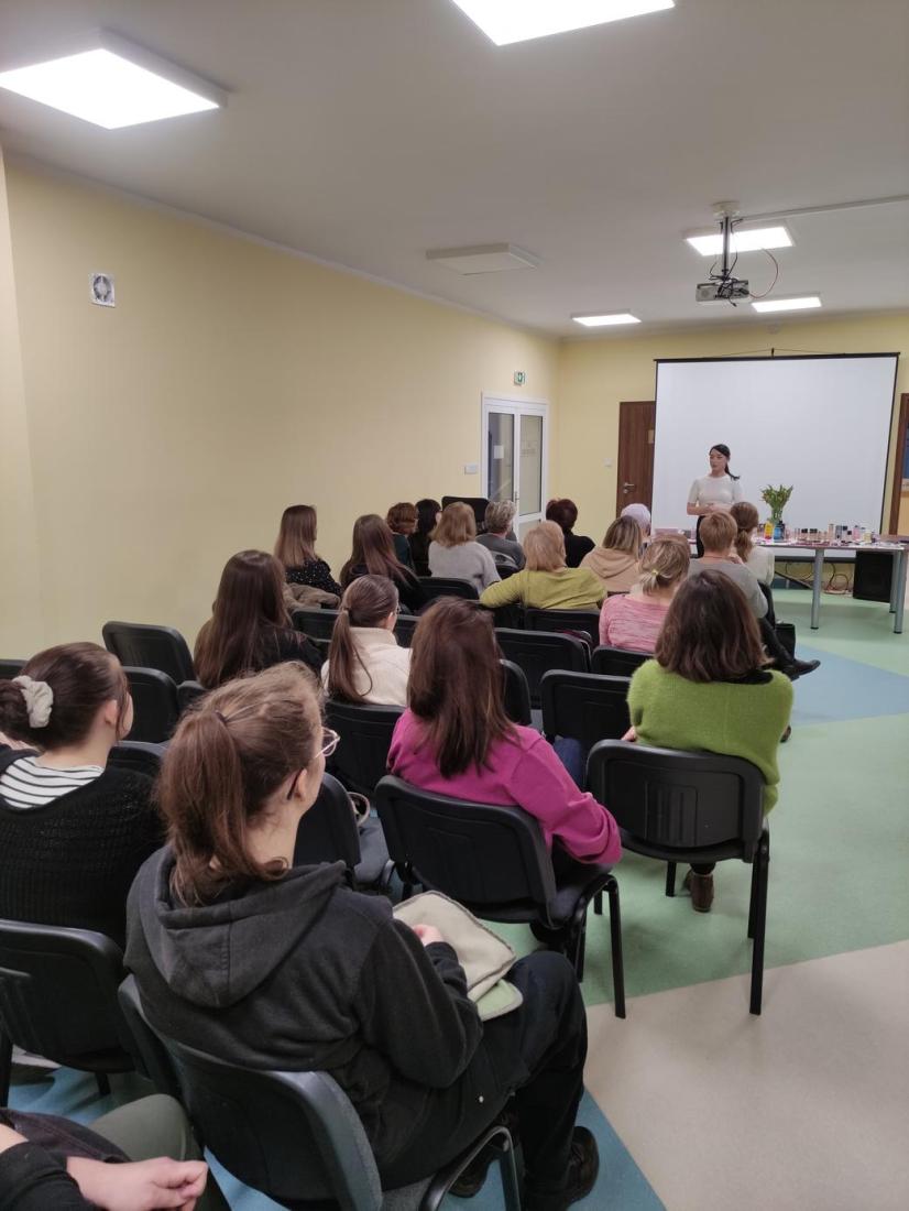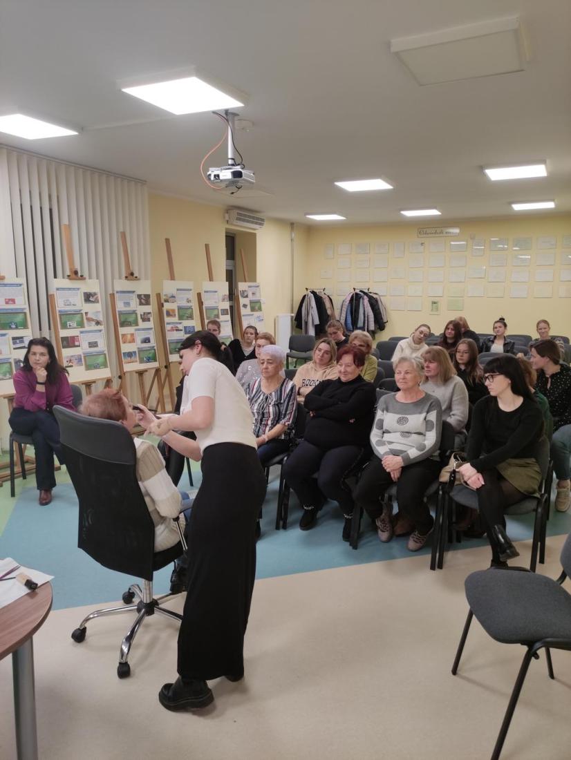 16 lutego 2024r., w Filii nr 1 odbyło się wyjątkowe spotkanie dla kobiet – „Zimowa szkoła makijażu”. Profesjonalna makijażystka p. Alicja Ołownia w bardzo szczegółowy sposób opisała licznie przybyłym Paniom metody pielęgnacji twarzy i ciała oraz pokazała, jakich kosmetyków warto używać, aby dbać o cerę i cieszyć się jej zdrowym i pięknym wyglądem. Spośród Pań wybrana została ochotniczka (modelka), której to wykonano profesjonalny makijaż, tłumacząc krok po kroku, w jaki sposób nakładać poszczególne kosmetyki i jakich używać przyrządów. Pani Alicja udzieliła cennych porad, jak dobierać makijaż adekwatny do wieku, typu urody oraz okazji. Uczestniczki szkolenia były bardzo zainteresowane tematem i dociekliwe – zadawały mnóstwo pytań, na które prowadząca udzielała wyczerpujących odpowiedzi. Panie miały również możliwość obejrzenia i wypróbowania polecanych kosmetyków do make-upu i pielęgnacji, z czego chętnie skorzystały.