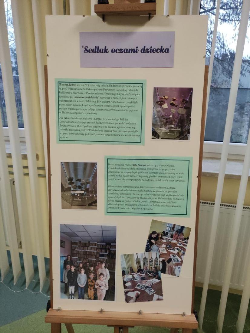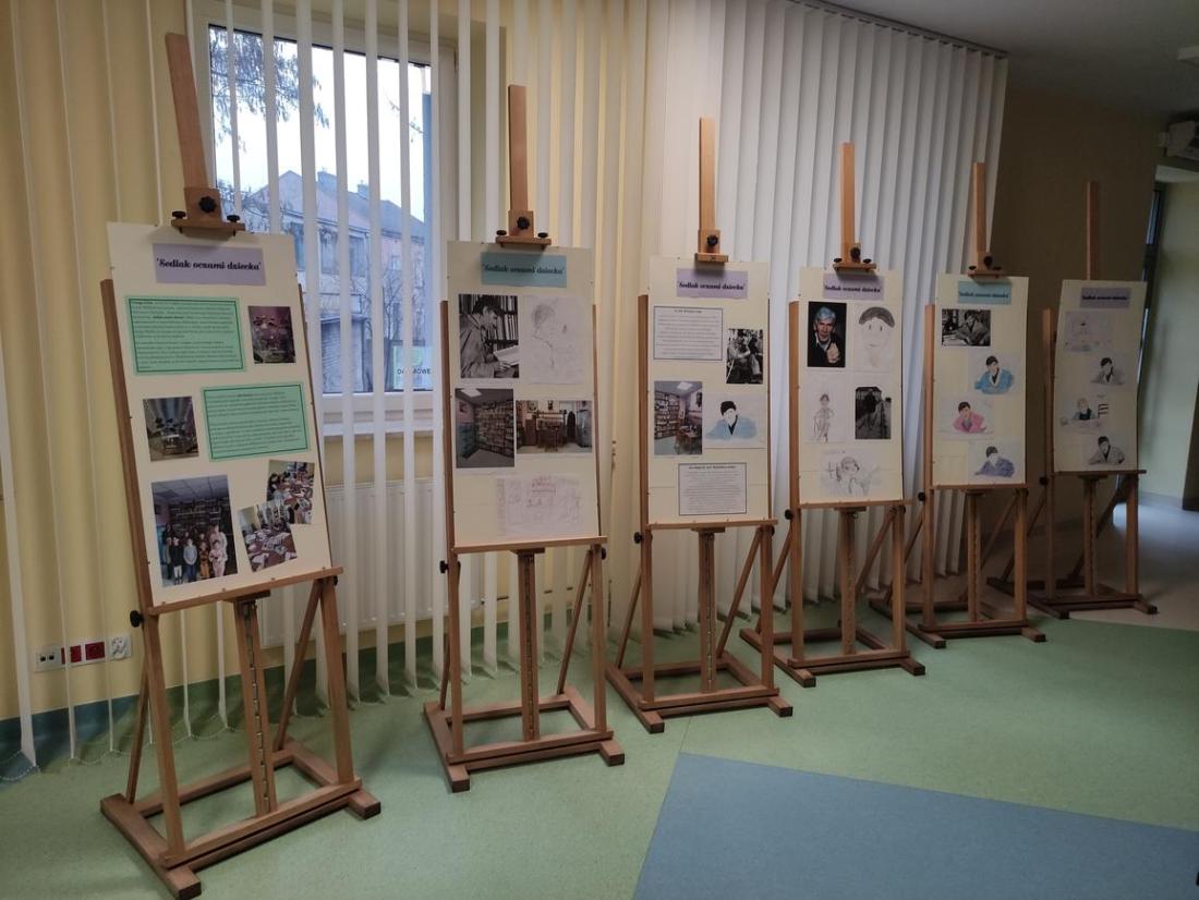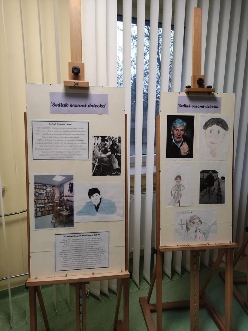 Wystawa przedstawia sylwetkę patrona biblioteki – Ks. prof. Włodzimierza Sedlaka widzianego oczami dzieci.