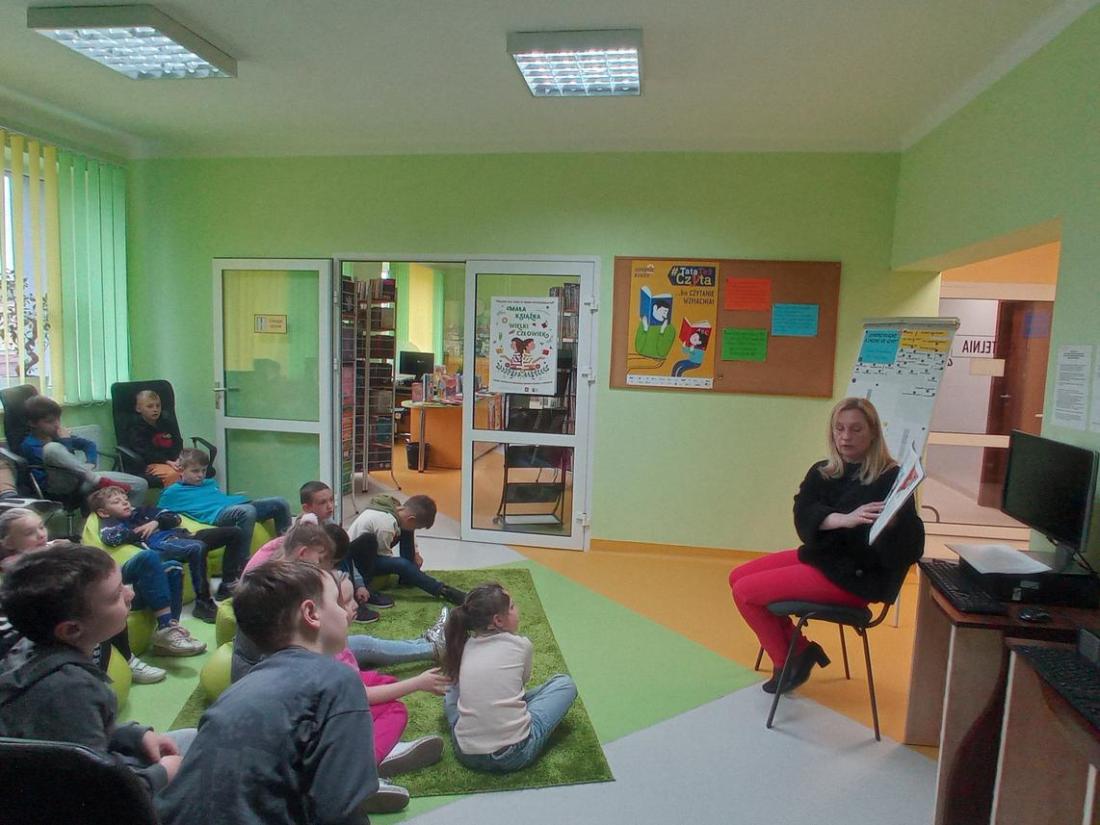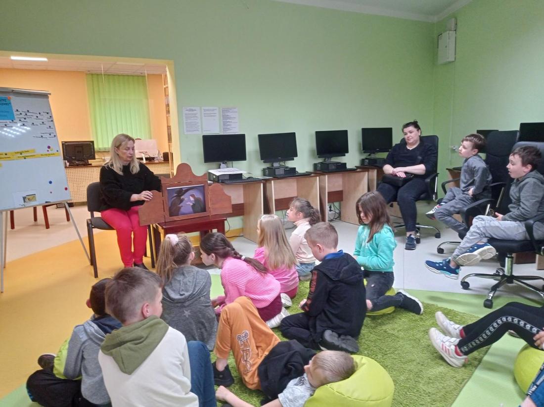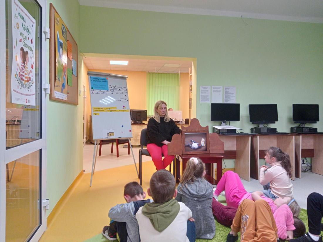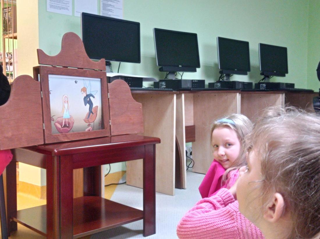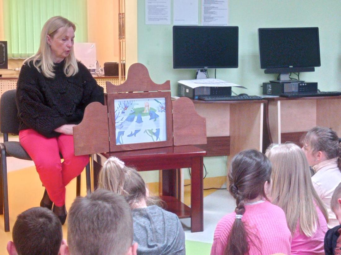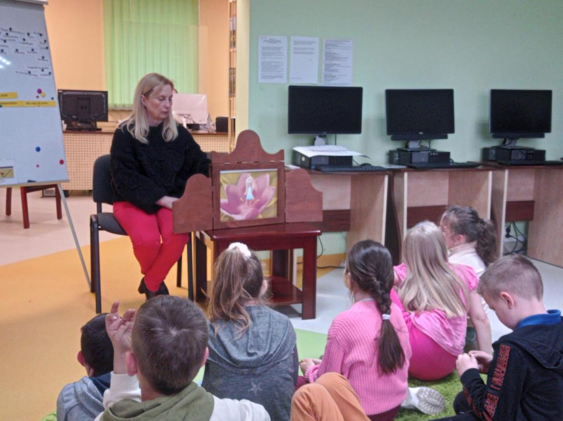 Uczniowie w skupieniu i z zainteresowaniem wysłuchali opowiedzianej przez bibliotekarza baśń pt.: „Calineczka”. Była to forma opowiedzenia baśni za pomocą obrazków wykonanych na specjalnych kartonowych planszach, która nazywa się teatrzykiem Kamishibai.