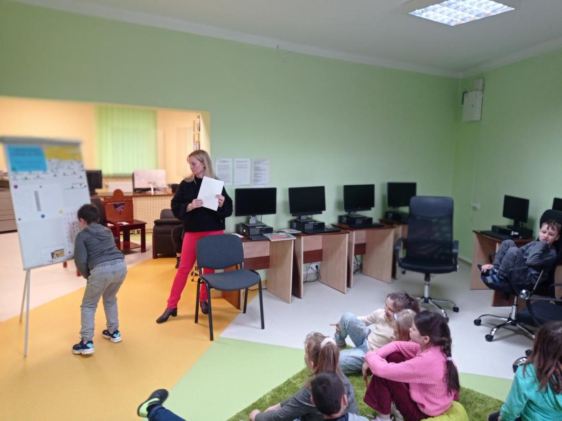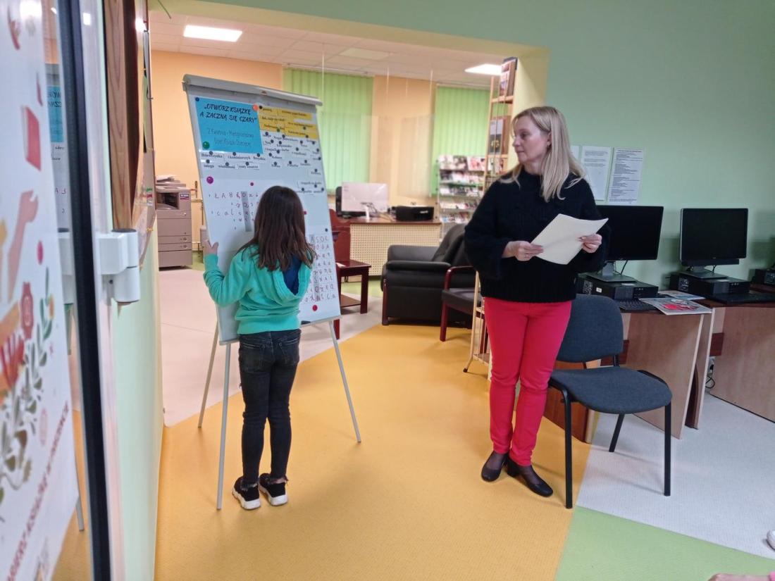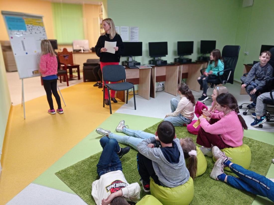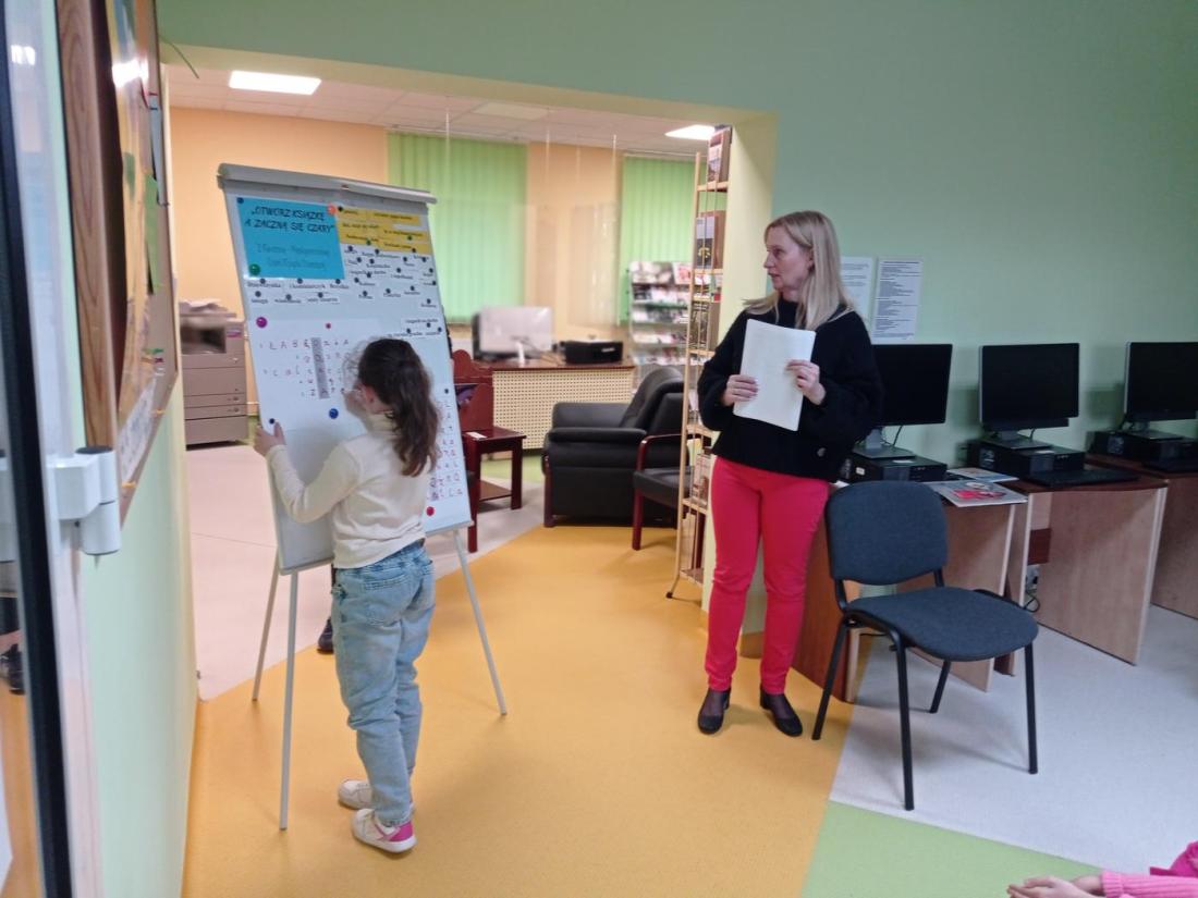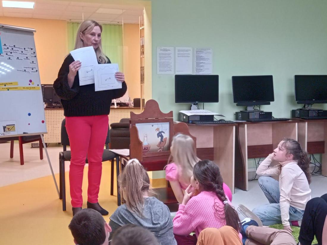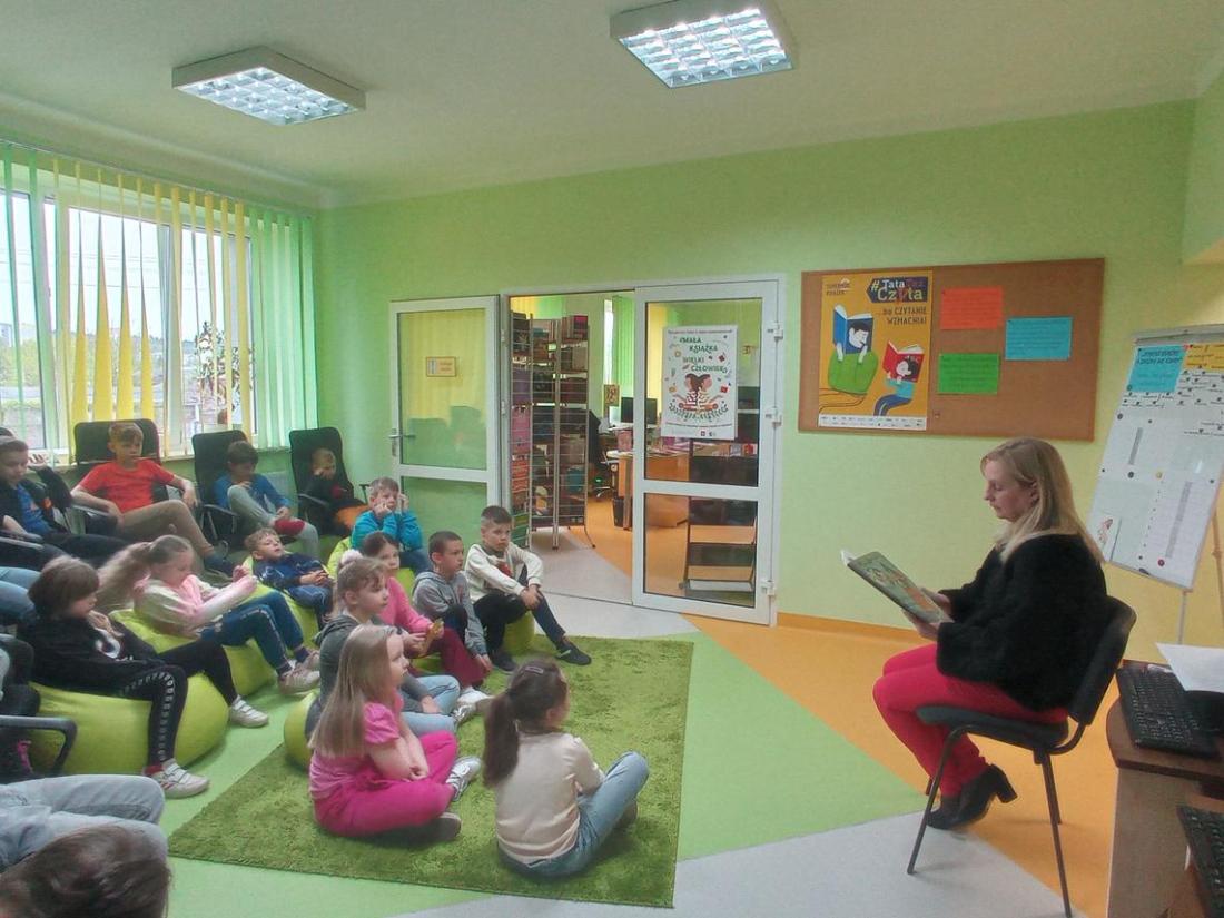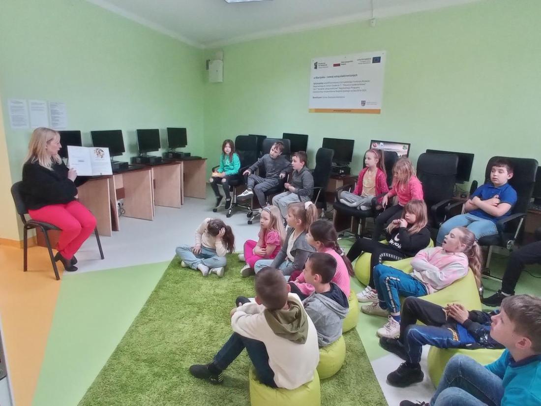 Uczniowie w skupieniu i z zainteresowaniem wysłuchali opowiedzianej przez bibliotekarza baśń pt.: „Calineczka”. Była to forma opowiedzenia baśni za pomocą obrazków wykonanych na specjalnych kartonowych planszach, która nazywa się teatrzykiem Kamishibai.