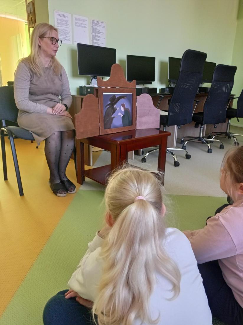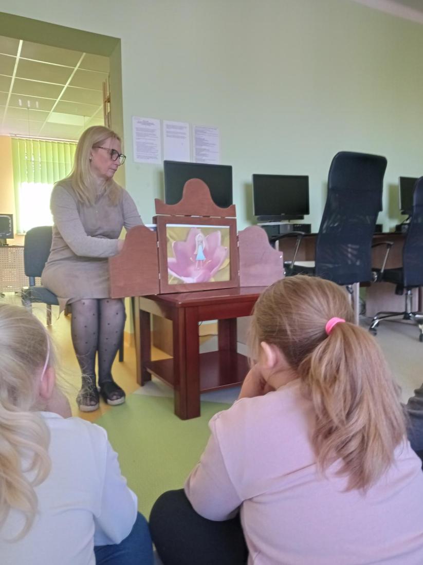 Urozmaiceniem zajęć było opowiedzenie przez bibliotekarza baśni pt.: „Calineczka”. Była to forma opowiedzenia baśni za pomocą obrazków wykonanych na specjalnych kartonowych planszach, która nazywa się teatrzykiem Kamishibai.