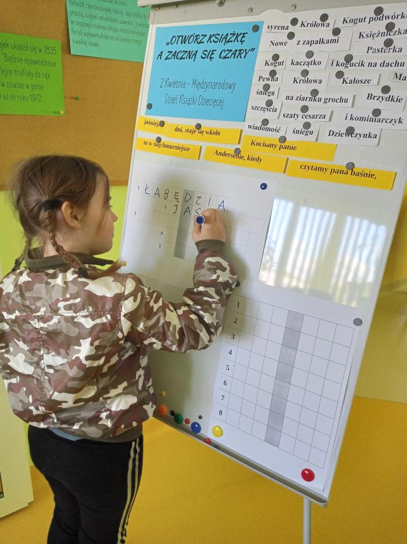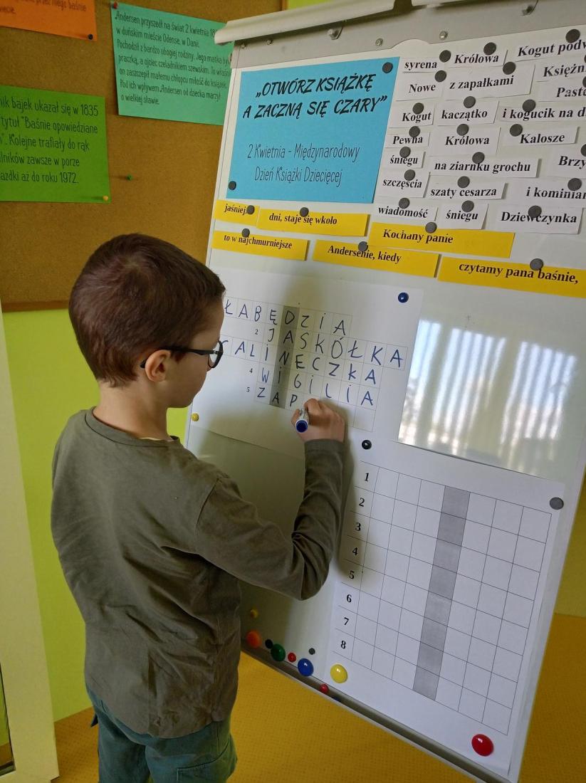 Uczniowie z zainteresowaniem wysłuchali baśniowej biografii H. Ch. Andersena pt.: „W poszukiwaniu szczęścia” W. Piaseckiej. Chętnie brali udział w zabawach edukacyjnych, odgadywali zagadki i rozwiązywali krzyżówki.