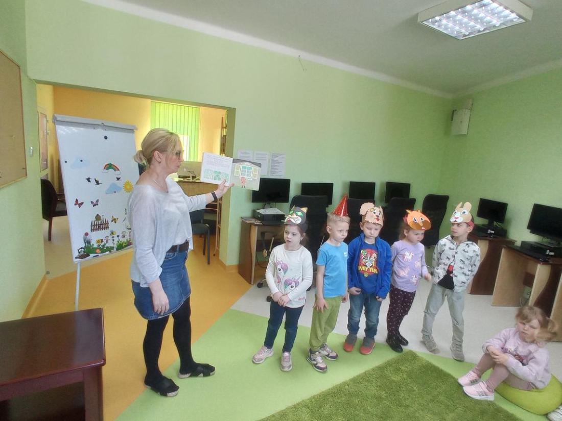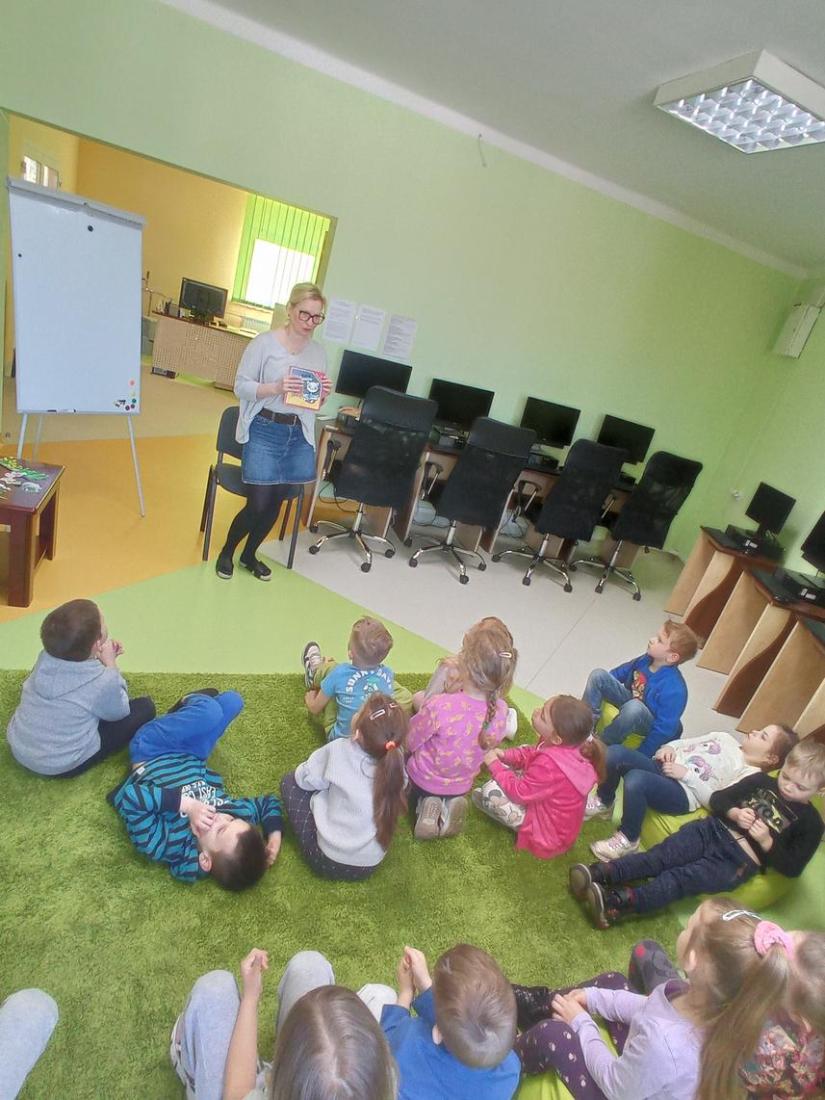 Dzieci w skupieniu wysłuchały przeczytanego przez bibliotekarza opowiadania pt.: „Kicia Kocia w bibliotece” i chętnie uczestniczyły w przygotowanych dla nich zabawach.