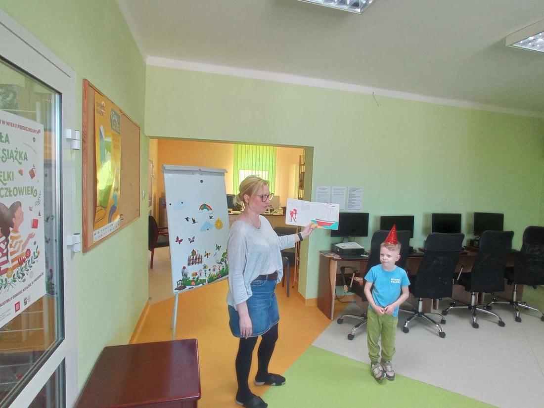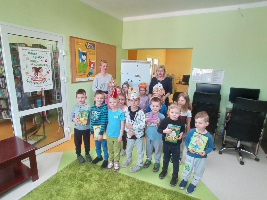 Na zakończenie dzieci otrzymały kolorowe zakładki do książek i foldery dla rodziców informujące o prowadzonej w bibliotece ogólnopolskiej akcji „Mała książka wielki człowiek”.