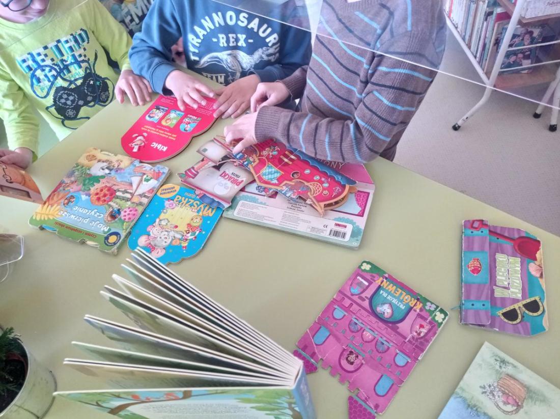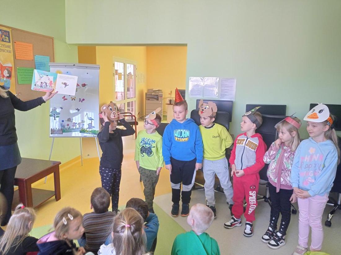 Dzieci w skupieniu wysłuchały przeczytanego przez bibliotekarza opowiadania pt.: „Kicia Kocia w bibliotece” i chętnie uczestniczyły w przygotowanych dla nich zabawach. Maluchy wcielając się w bohaterów opowiadania H. Bechlerowej pt.: „Otwórz okienko” zabawiły się w mini teatrzyk.
