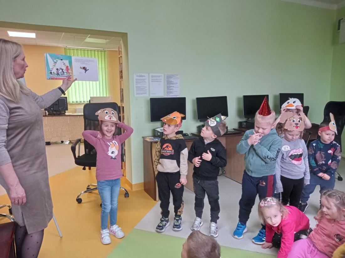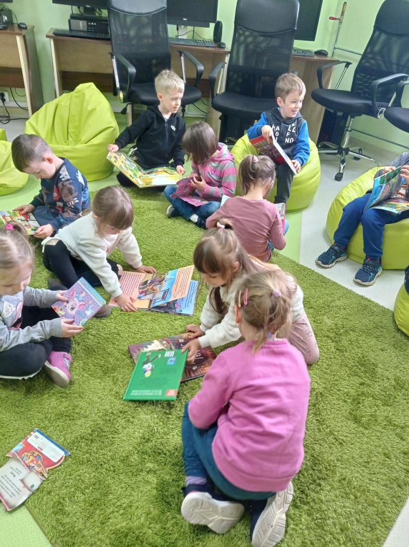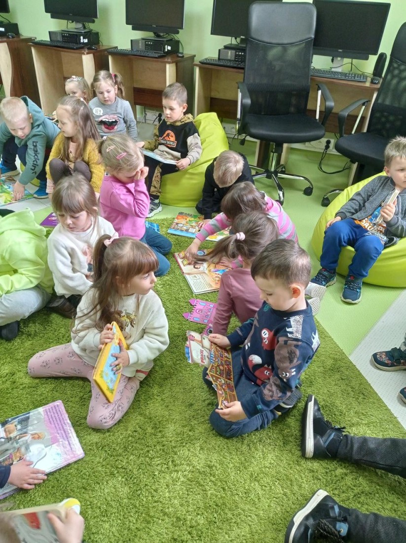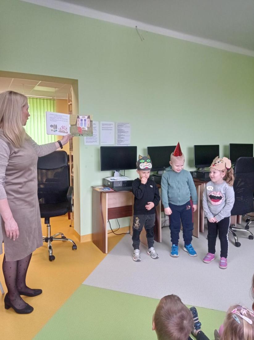 Przedszkolaki zwiedziły Oddział dla dzieci, dowiedziały się co należy zrobić, aby stać się czytelnikiem biblioteki oraz jak należy się w niej zachowywać. Dzieciom bardzo spodobały się kolorowe i bogato ilustrowane książki, które z chęcią oglądały. Wysłuchały przeczytanego przez bibliotekarza opowiadania pt.: „Kicia Kocia w bibliotece” i chętnie uczestniczyli w przygotowanych zabawach.