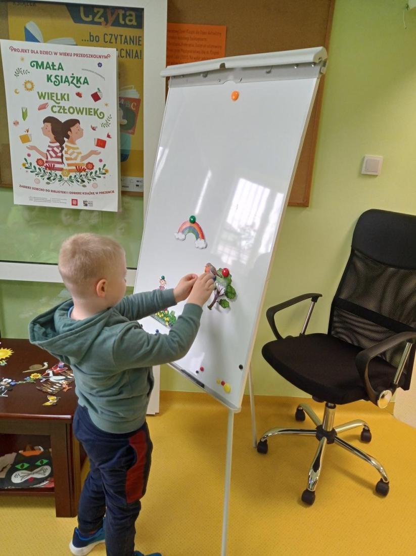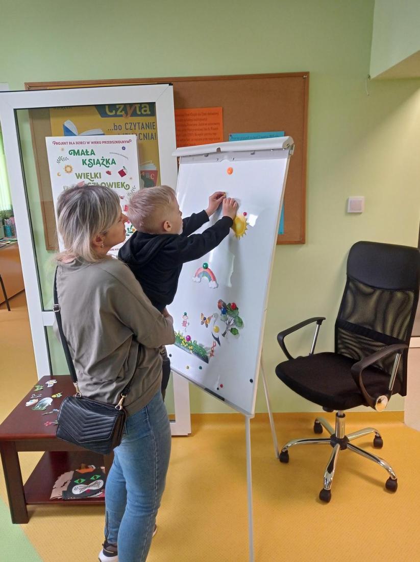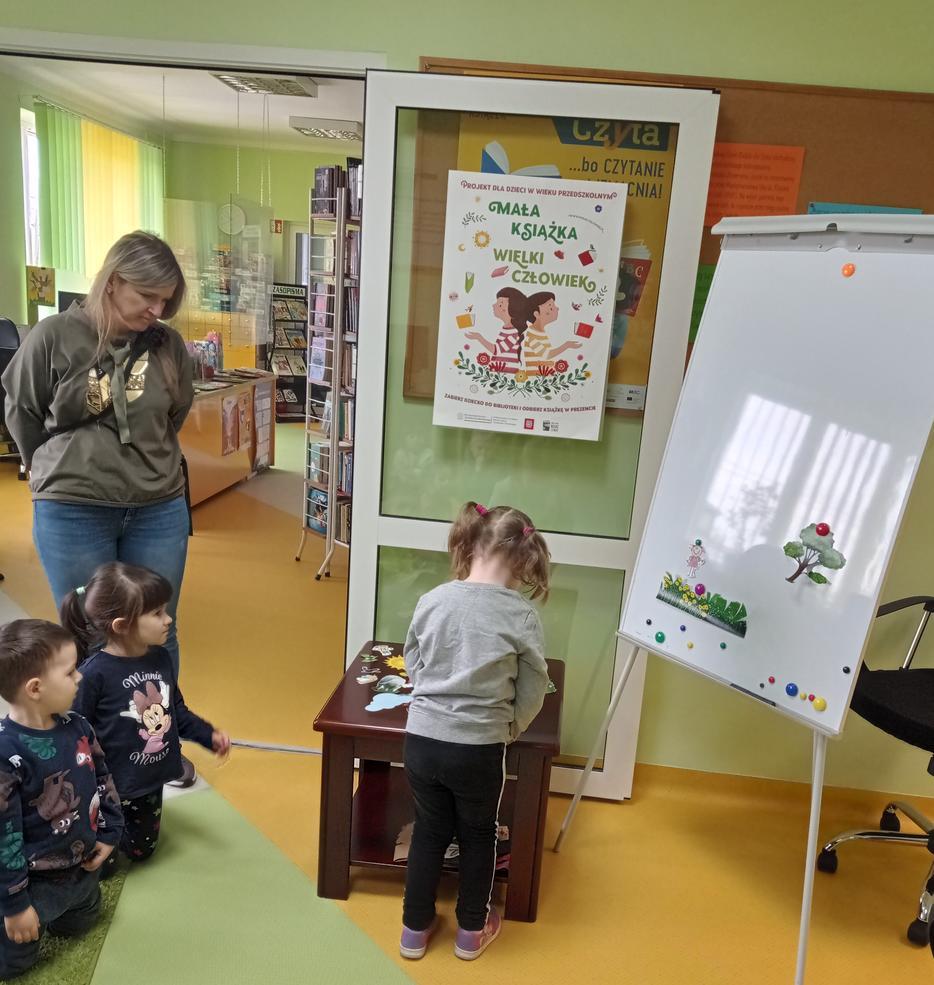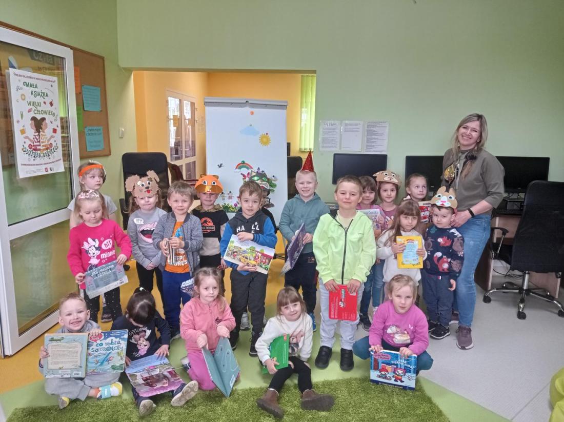 Na zakończenie dzieci otrzymały kolorowe zakładki do książek i foldery dla rodziców informujące o prowadzonej w bibliotece ogólnopolskiej akcji „Mała książka wielki człowiek”.