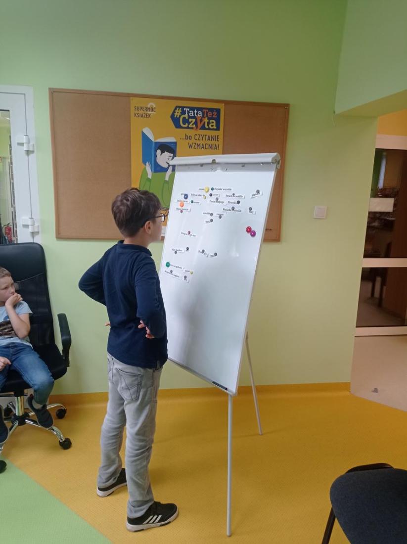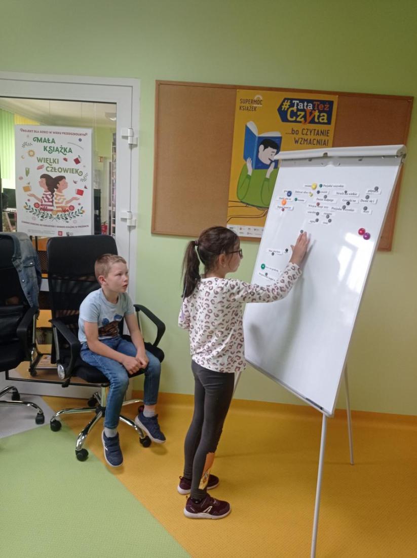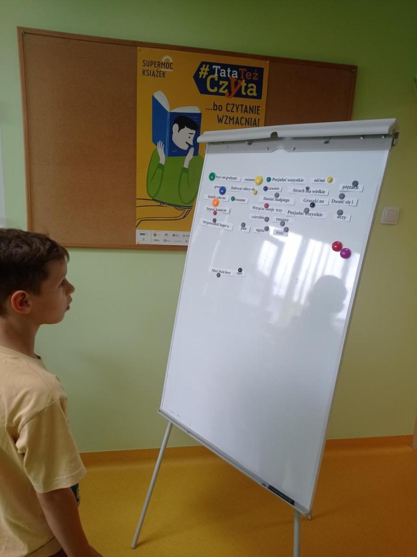 10 czerwca w Oddziale Dziecięcym Filii nr 1 odbyły się kolejne zajęcia w ramach Ogólnopolskiego Tygodnia Czytania Dzieciom, który w tym roku odbywa się pod hasłem: „Porozmawiajmy o książkach, Tygrysie”. W zajęciach uczestniczyli uczniowie z klasy drugiej ze Szkoły Podstawowej nr 8 wraz z wychowawcą. Dzieci z zainteresowaniem słuchały czytanego przez bibliotekarza opowiadania Grzegorza Kasdepki pt.: „ Co to znaczy… czyli 101 zabawnych historyjek, które pozwolą zrozumieć znaczenie niektórych powiedzeń”. Dzięki temu poznaliśmy bohatera książki Bartusia, jego wesołą rodzinkę i szereg zabawnych, z życia wziętych sytuacji wyjaśniających znaczenie powiedzonek: „ciepłe kluchy”, „być nie w sosie”, „biały kruk”, „kozioł ofiarny” czy „być na świeczniku”. Dzieci świetnie poradziły sobie bawiąc się w przysłowiowe kalambury oraz układając przysłowia z rozsypanki wyrazowej.