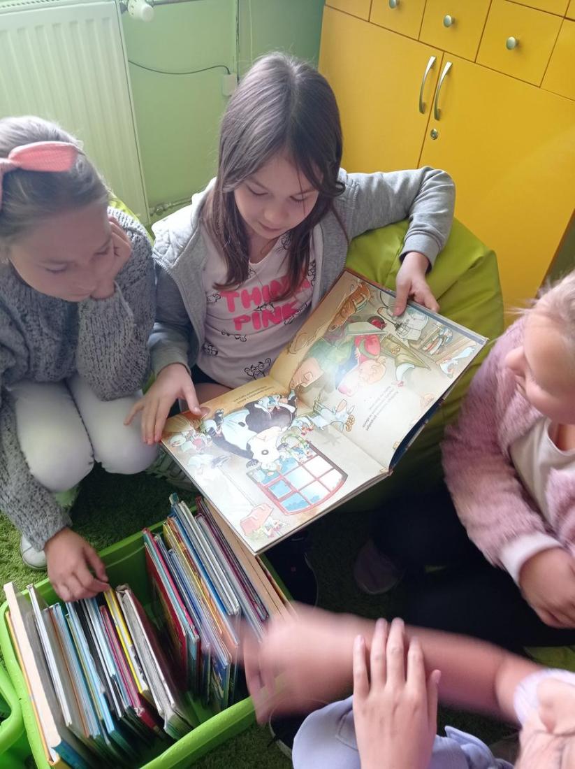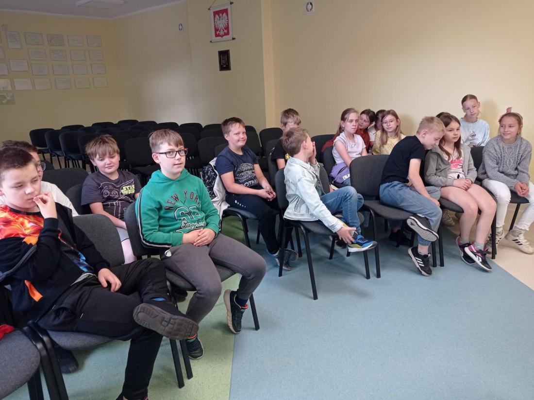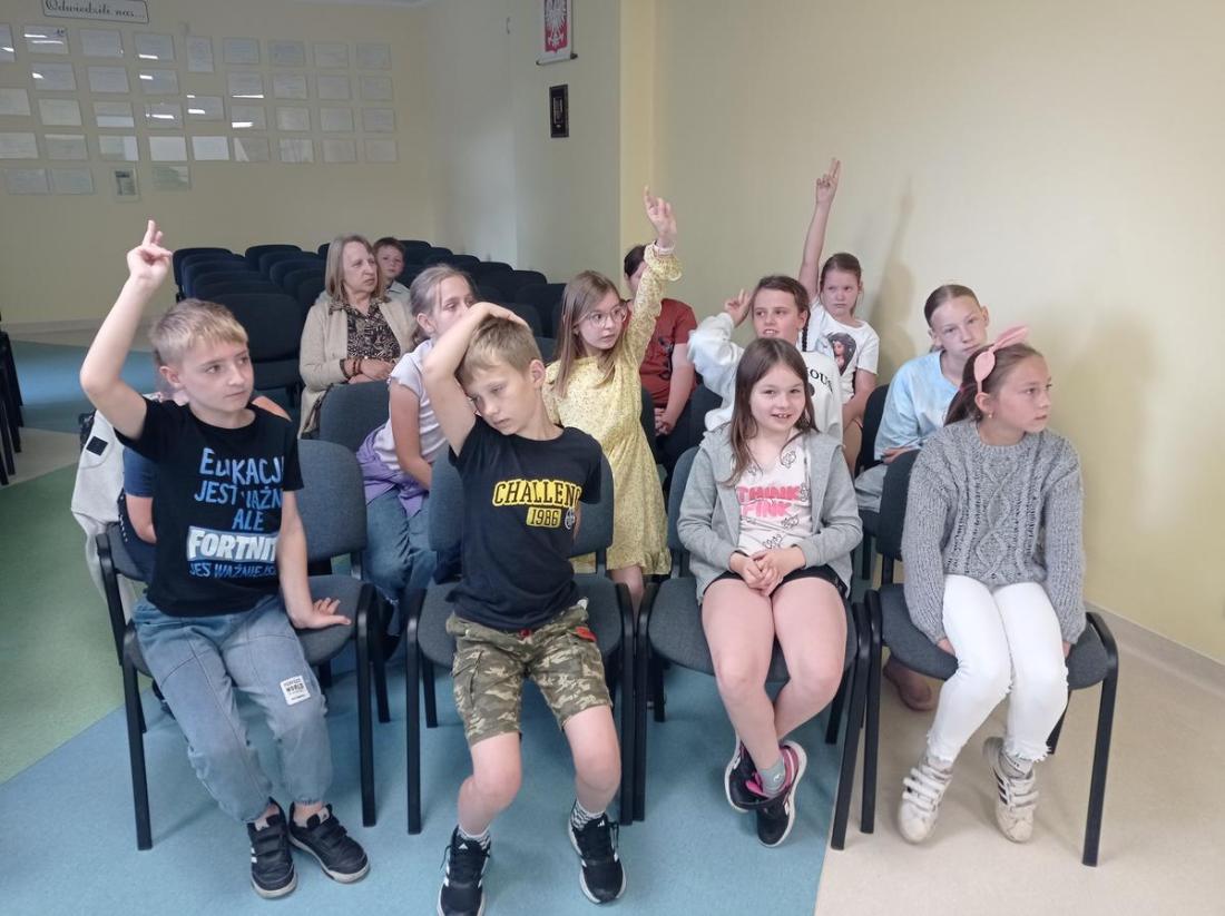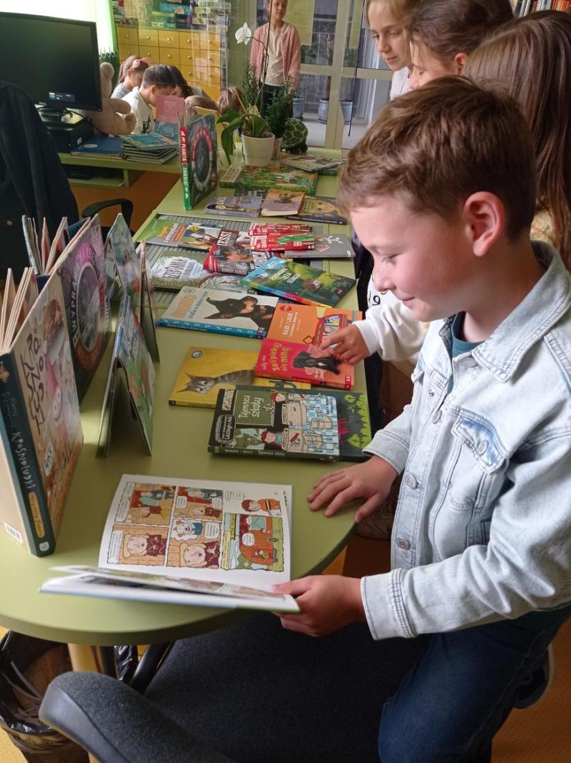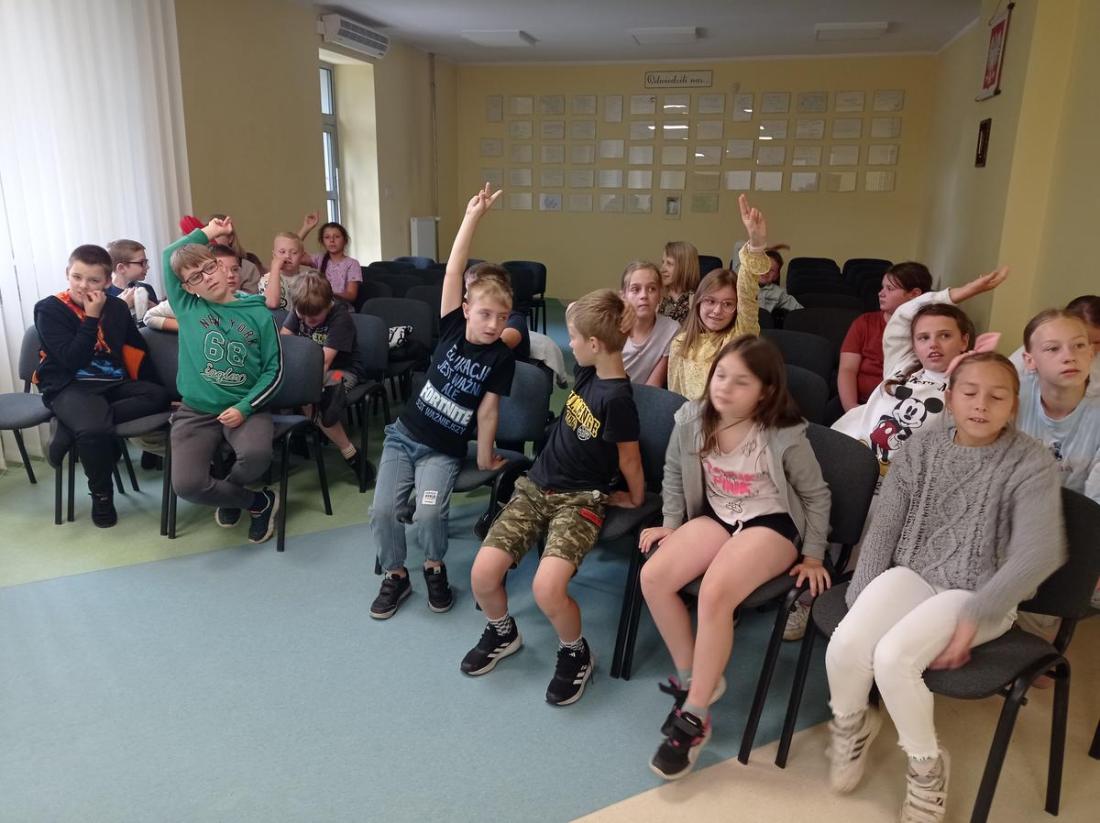 Bibliotekarz przeczytał również opowiadania Grzegorza Kasdepki pt.: „ Co to znaczy… czyli 101 zabawnych historyjek, które pozwolą zrozumieć znaczenie niektórych powiedzeń”. W ten sposób przybliżyliśmy dzieciom powiedzenia i przysłowia. Dużo radości i śmiechu było podczas prezentacji powiedzeń tj.: „łamać sobie głowę”, „biec jak na skrzydłach”, „zapuszczać żurawia” czy „chodzić spać z kurami”. Bawiąc się w przysłowiowe kalambury i układając rozsypankę z wyrazów uczniowie wykazali się wiedzą i kreatywnością. Nie zabrakło czasu na obejrzenie książek, które gromadzone są w bibliotece z myślą o jej młodszych czytelnikach. Dziękujemy za miłe spotkanie uczniom i ich opiekunom.
