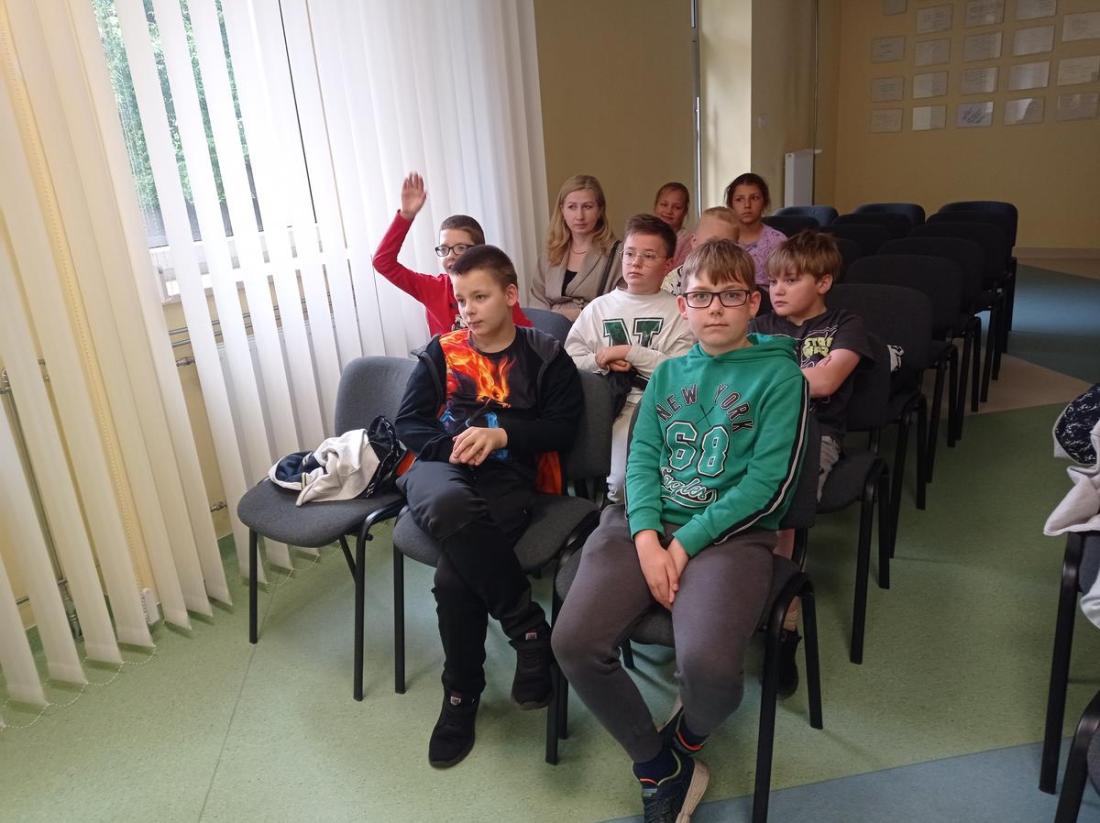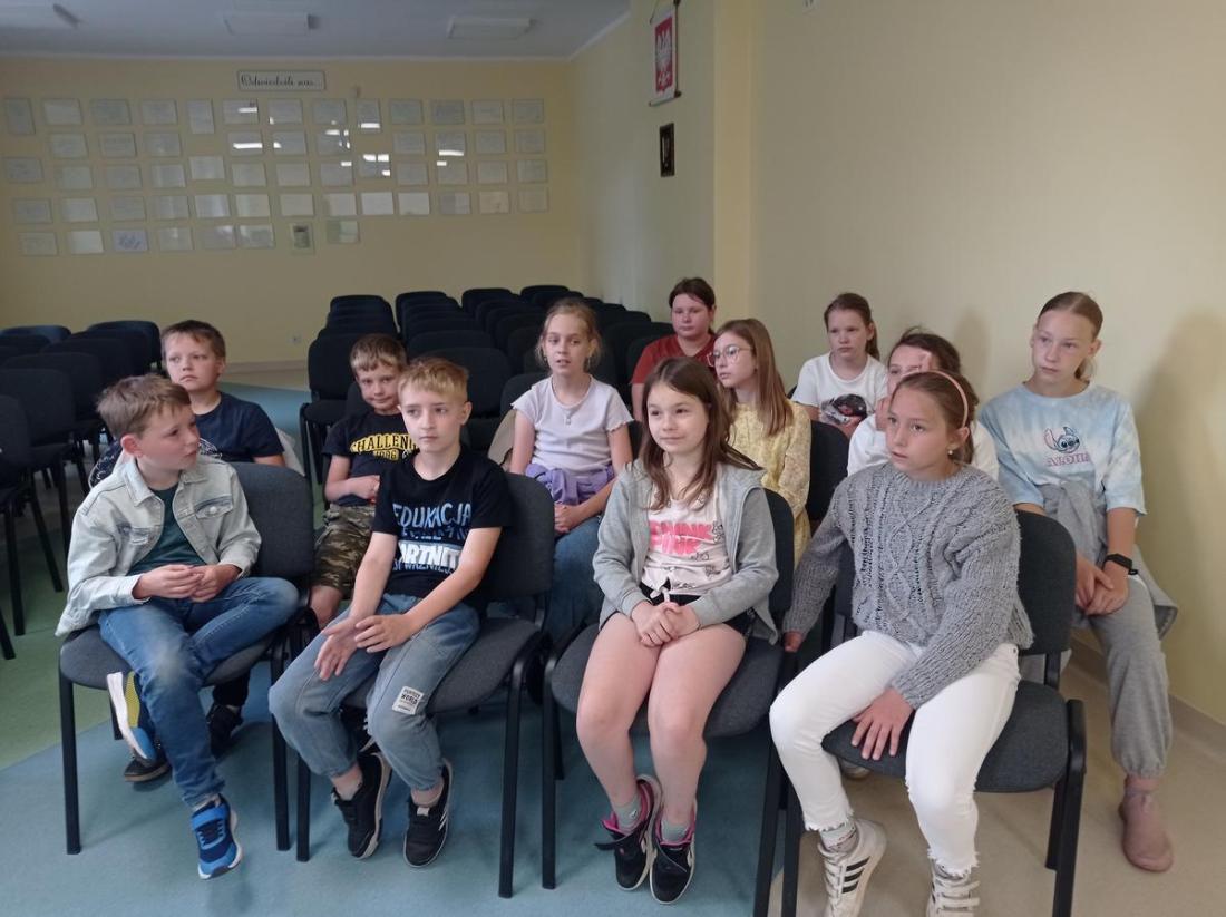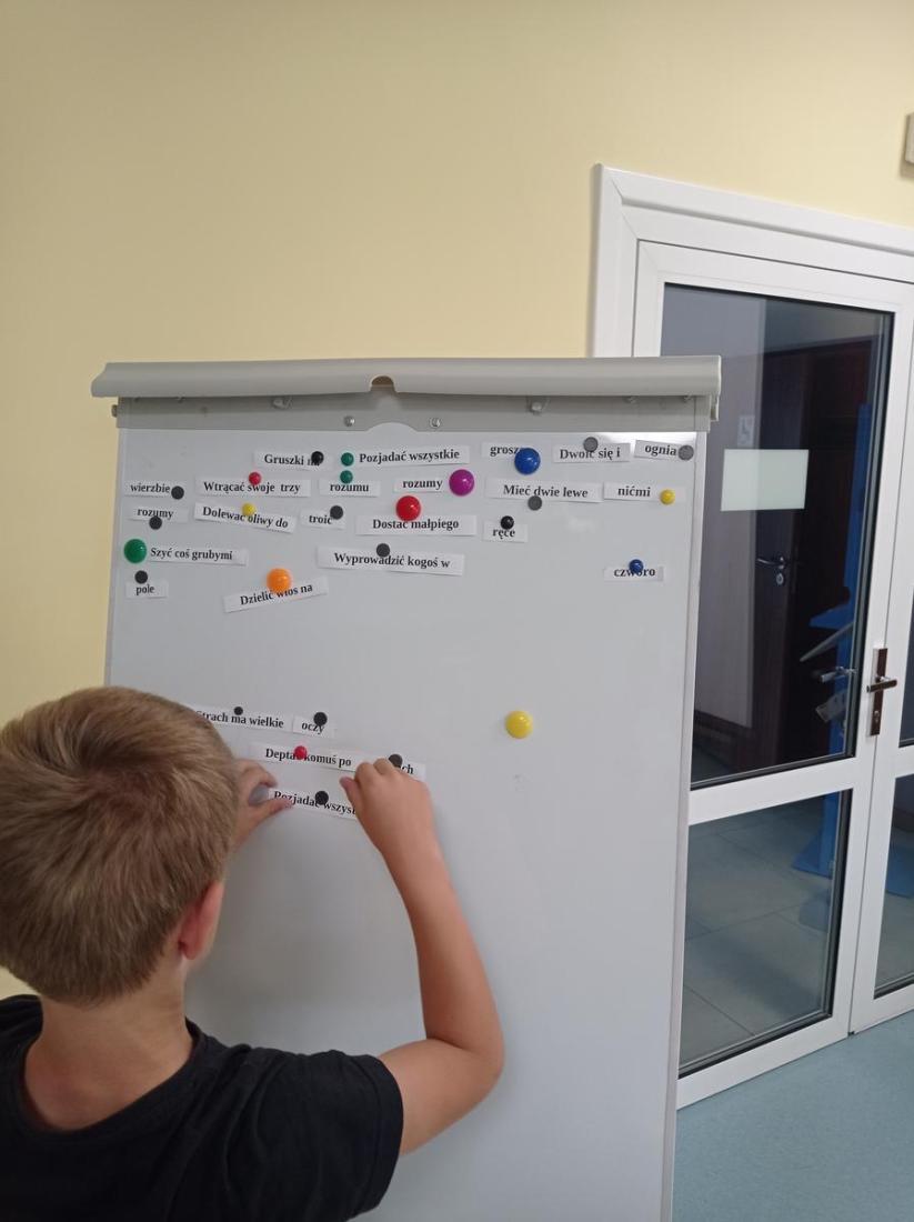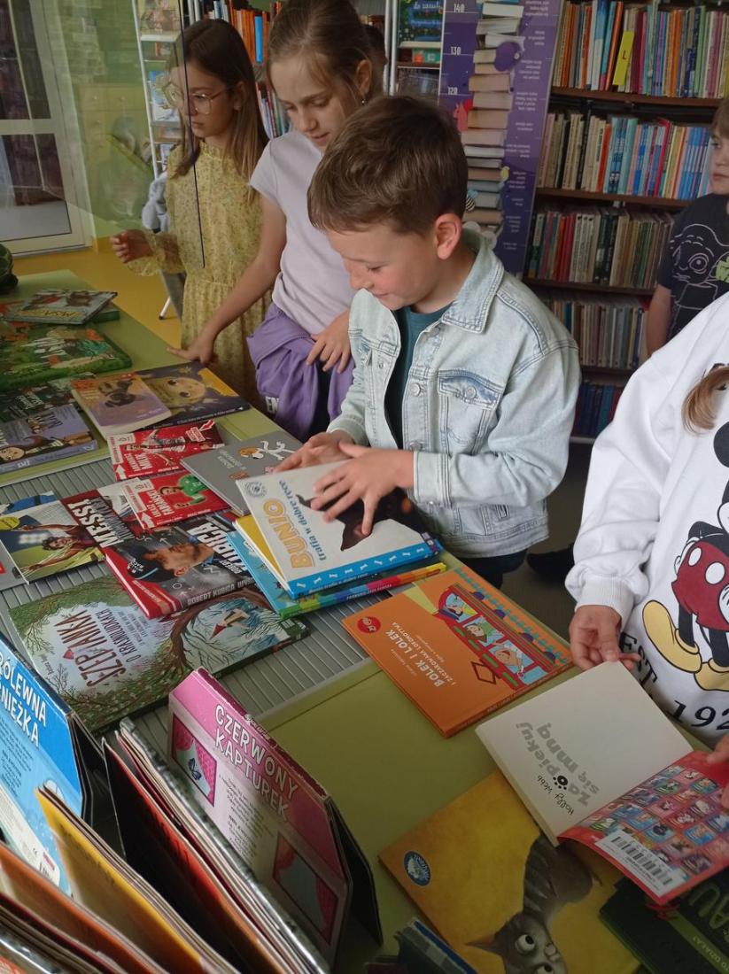 Bibliotekarz przeczytał również opowiadania Grzegorza Kasdepki pt.: „ Co to znaczy… czyli 101 zabawnych historyjek, które pozwolą zrozumieć znaczenie niektórych powiedzeń”. W ten sposób przybliżyliśmy dzieciom powiedzenia i przysłowia. Dużo radości i śmiechu było podczas prezentacji powiedzeń tj.: „łamać sobie głowę”, „biec jak na skrzydłach”, „zapuszczać żurawia” czy „chodzić spać z kurami”. Bawiąc się w przysłowiowe kalambury i układając rozsypankę z wyrazów uczniowie wykazali się wiedzą i kreatywnością. Nie zabrakło czasu na obejrzenie książek, które gromadzone są w bibliotece z myślą o jej młodszych czytelnikach. Dziękujemy za miłe spotkanie uczniom i ich opiekunom.