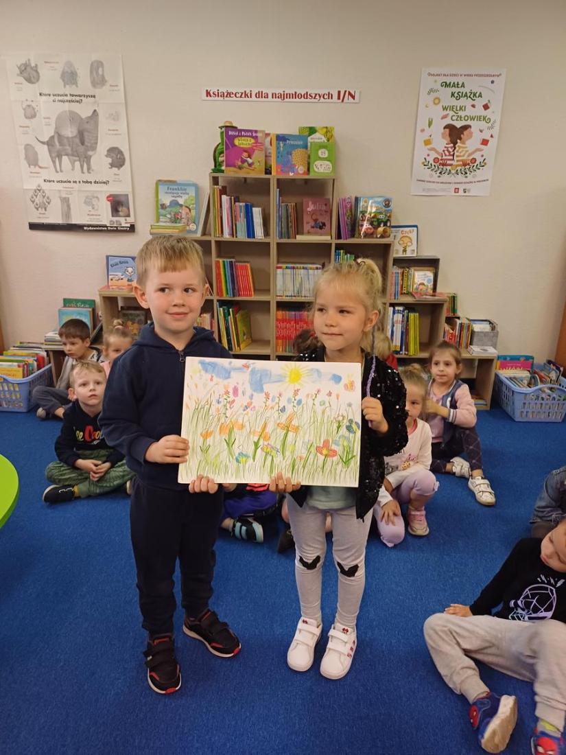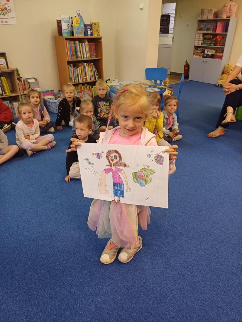 Dzieci przygotowały dla bibliotekarki wspaniałą niespodziankę – przyniosły malutki upominek – własnoręcznie namalowany rysunek przedstawiający nadchodzące lato oraz portret pani bibliotekarki.