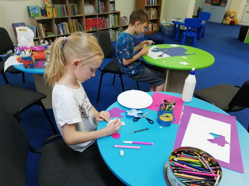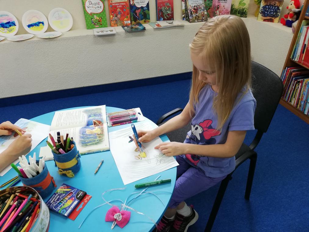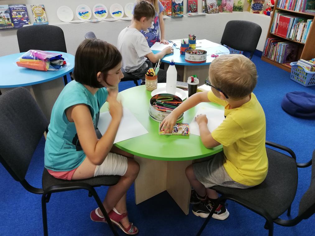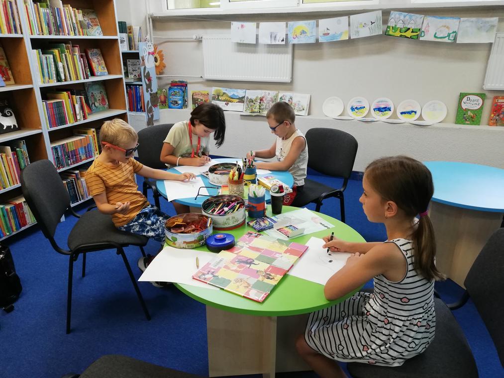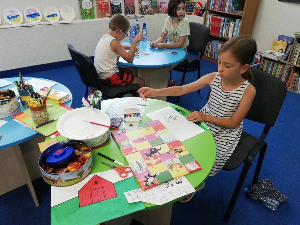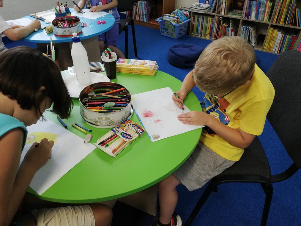 „Kolorowe lato” – Po przeczytaniu książeczki „Karolina na wsi”, uczestnicy zajęć zabrali się za wykonywanie ilustracji do usłyszanej historii. Przedstawiały one wiejskie krajobrazy oraz kreatywne sposoby spędzania czasu na wsi. Dzięki pieczątkom obrazki szybko zapełniły się przeróżnymi zwierzątkami – od kurczaków zaczynając a na świnkach kończąc. Reszta zajęć upłynęła na graniu w planszówki.