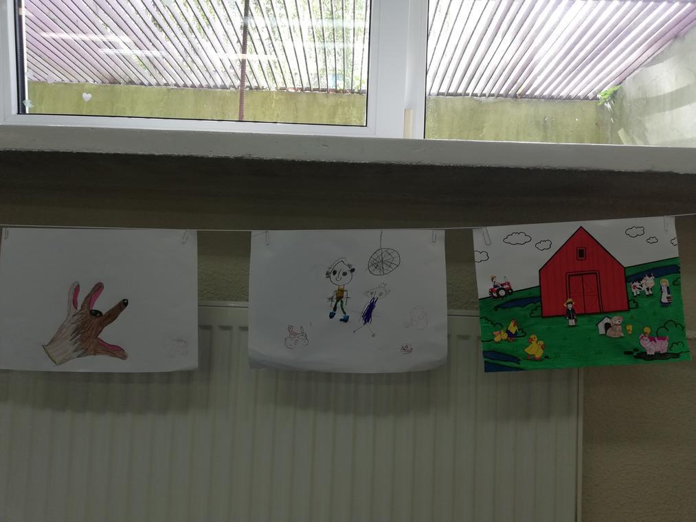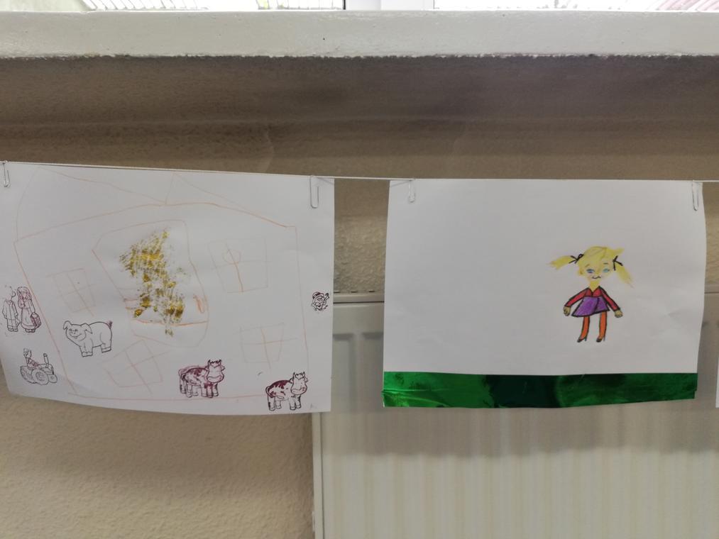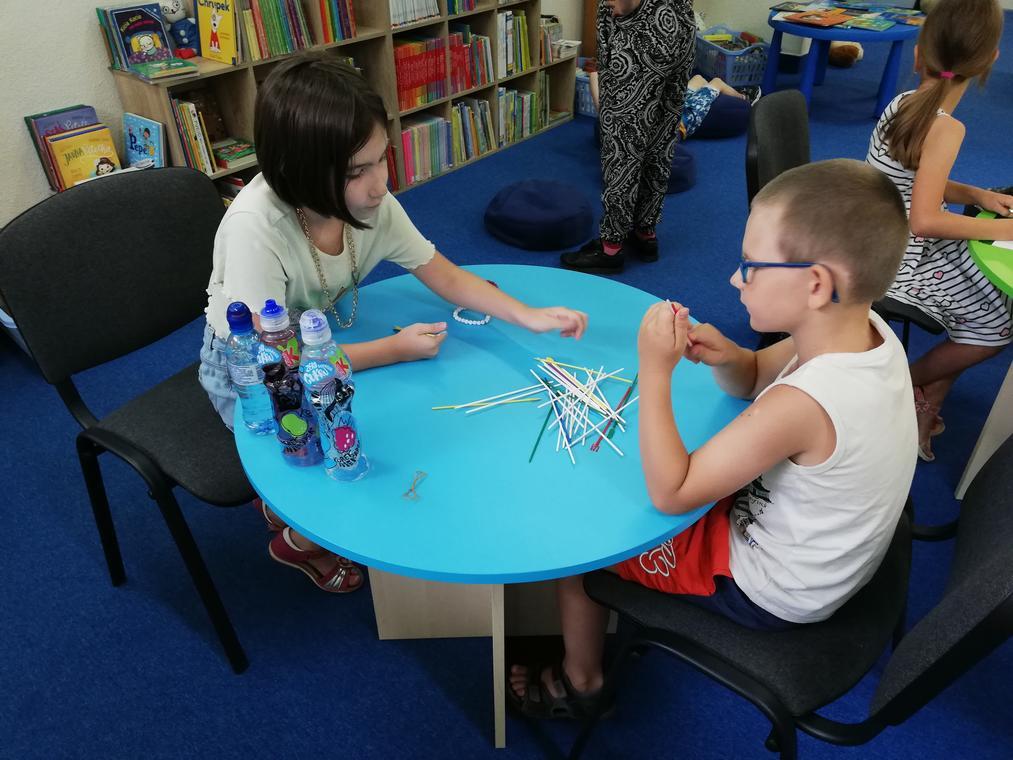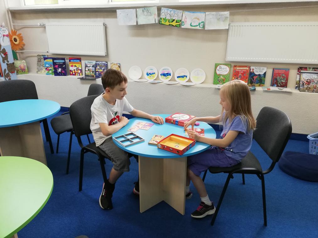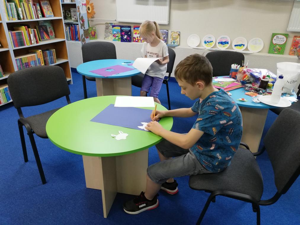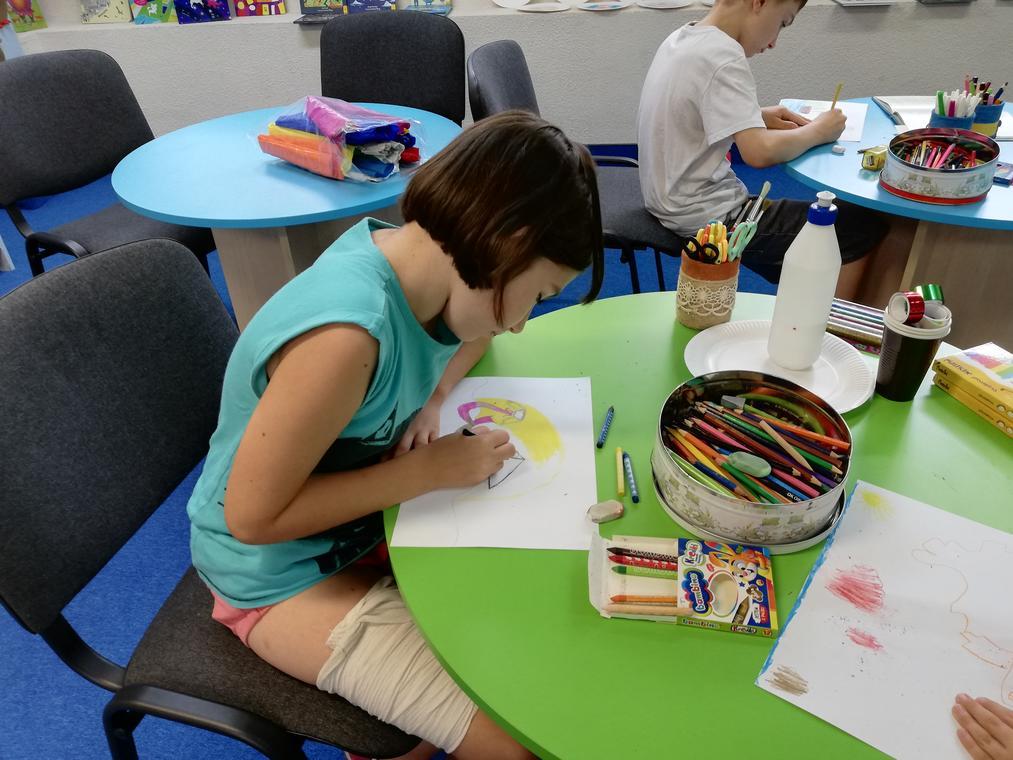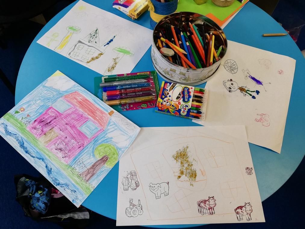 „Kolorowe lato” – Po przeczytaniu książeczki „Karolina na wsi”, uczestnicy zajęć zabrali się za wykonywanie ilustracji do usłyszanej historii. Przedstawiały one wiejskie krajobrazy oraz kreatywne sposoby spędzania czasu na wsi. Dzięki pieczątkom obrazki szybko zapełniły się przeróżnymi zwierzątkami – od kurczaków zaczynając a na świnkach kończąc. Reszta zajęć upłynęła na graniu w planszówki.