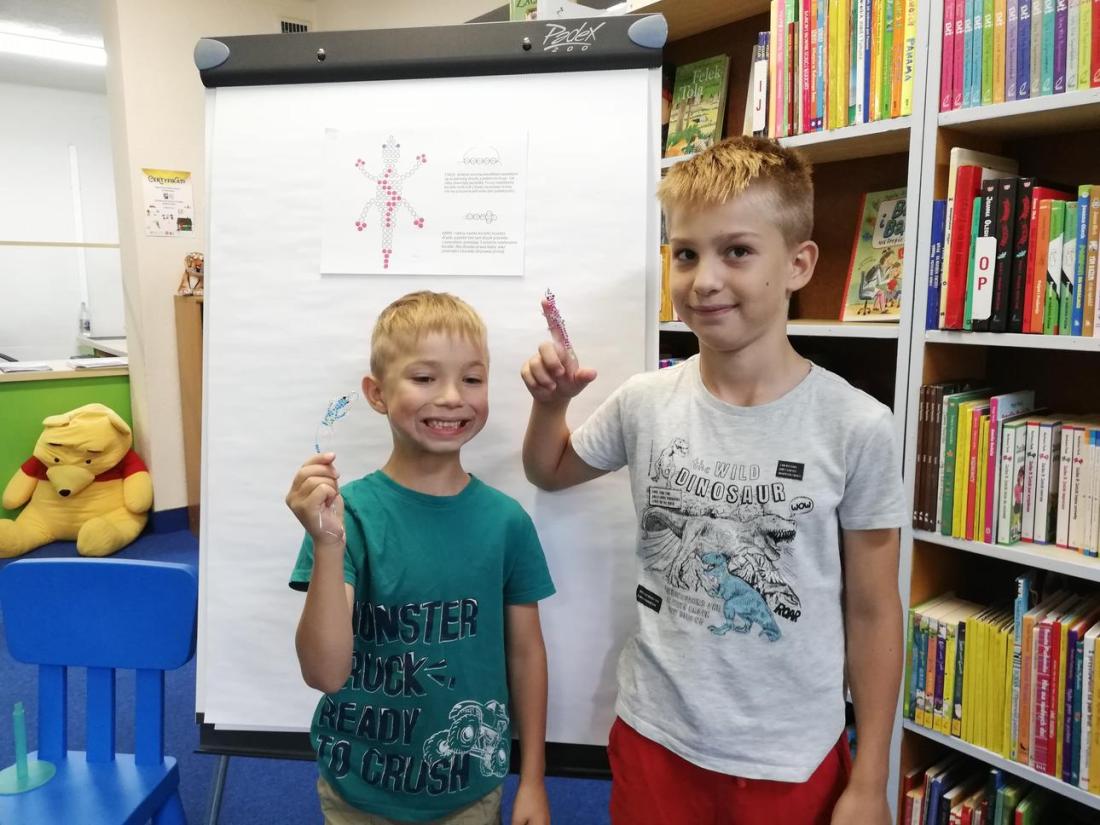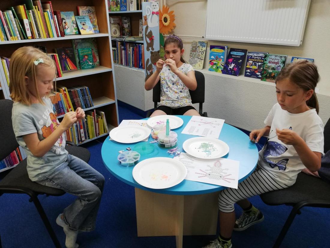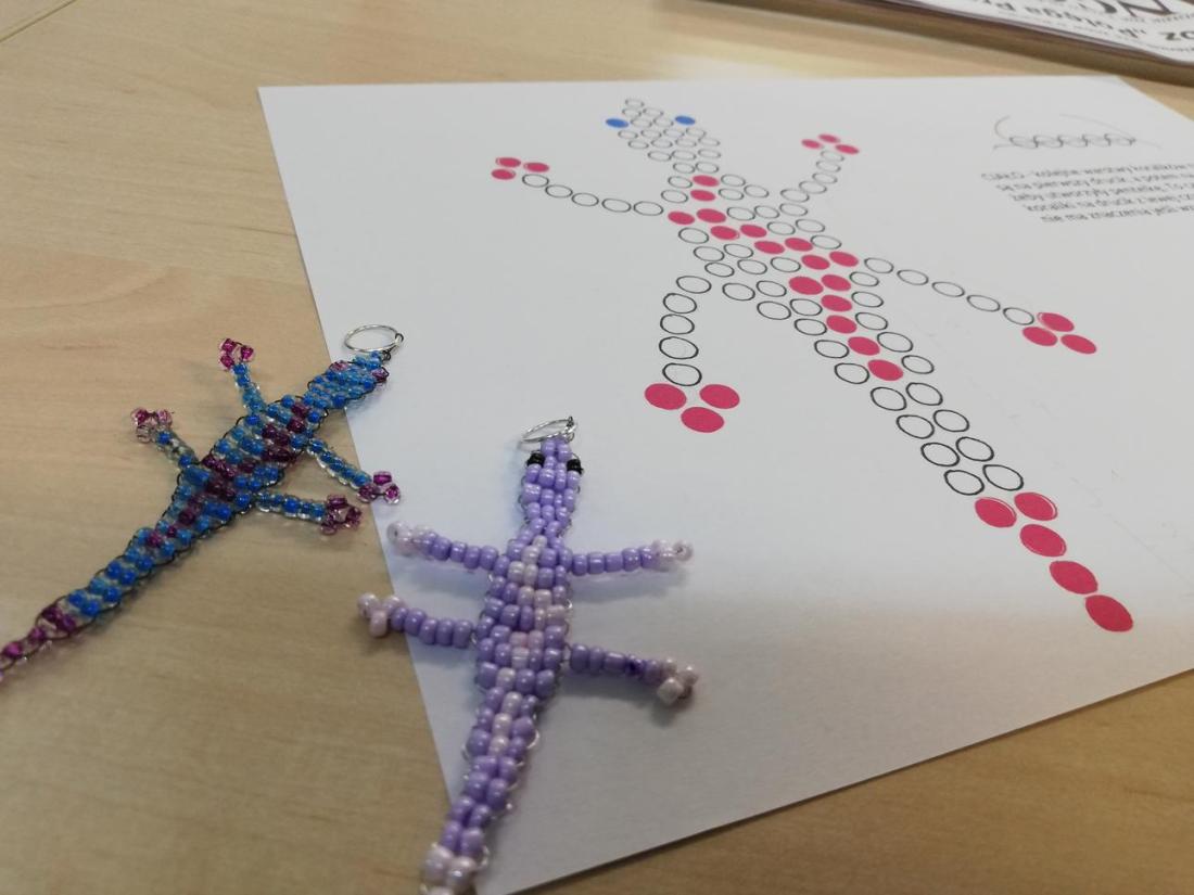 „Pomysł na…biżuterię” – W czwartek uczestnicy zajęć wykonywali breloczki z koralików. Było to nie lada wyzwanie, ponieważ wymagało nauki nowej techniki nawlekania. Jak to zwykle bywa początki były trudne, lecz dzieci nie ustawały w pracy. Dzięki wytrwałości koralikowe jaszczurki z każdą chwilą stawały się coraz dłuższe. Nawet najmłodsi świetnie sobie radzili!