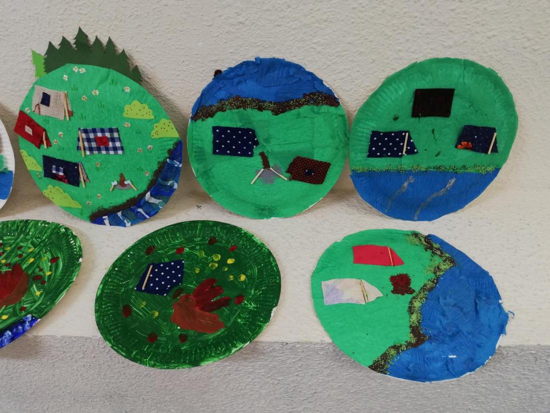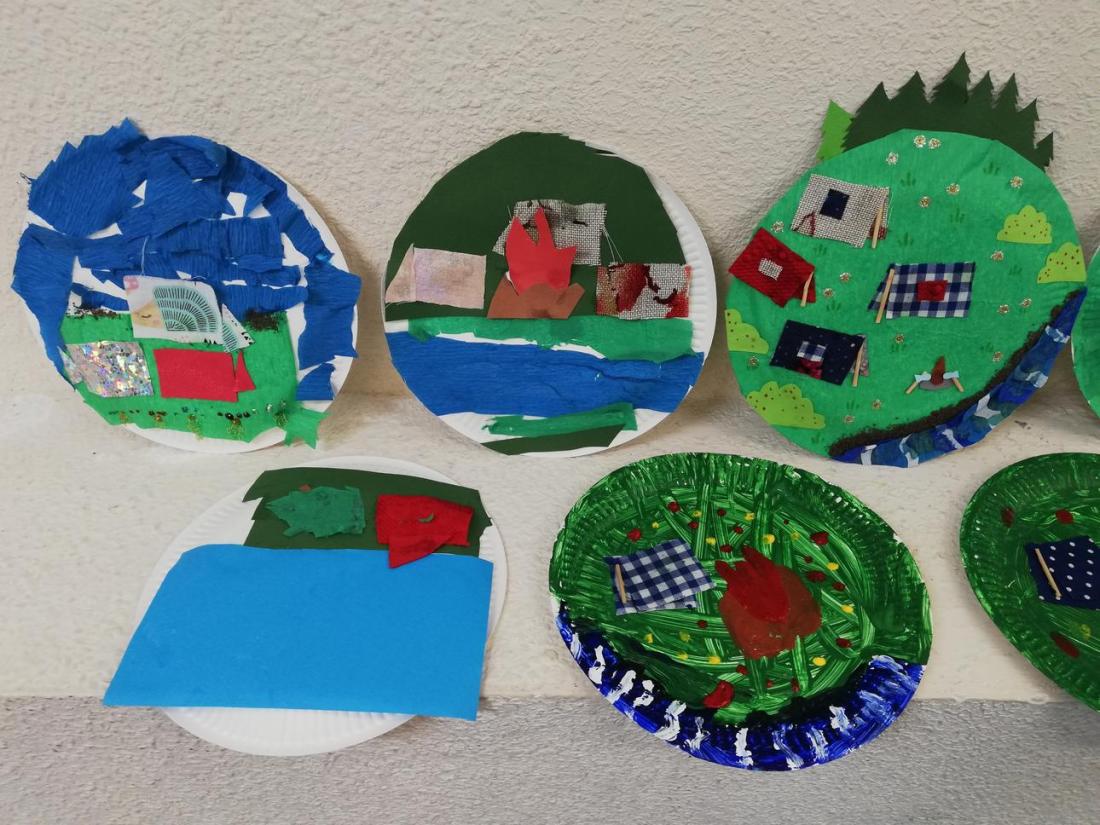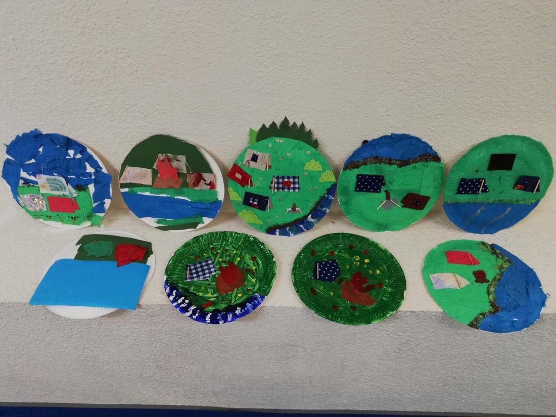 „Kolorowe lato” – Na koniec tygodnia powróciliśmy do lekkich i przyjemnych zajęć, podczas których uczestnicy wykonywali obrazki na papierowych talerzykach. Tym razem przedstawiały one wakacje pod namiotami. Polanki powstały z wykorzystaniem farb, kolorowego papieru lub bibuły, za to namioty wycięto z prawdziwych materiałów, co nadało ilustracjom niezwykłego uroku.
