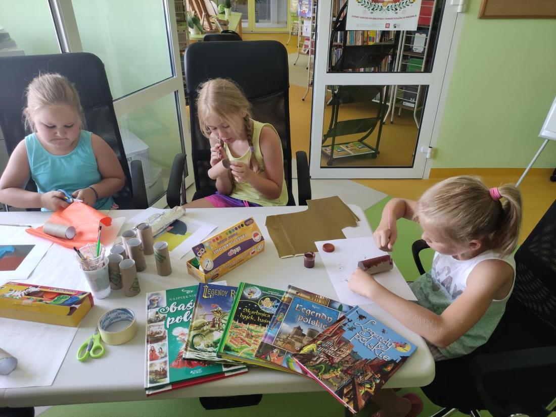 Na zajęciach „Wyprawy książkowe w krainy bajkowe” dzieci poznały najpiękniejsze polskie legendy – szczególnie interesowały się tymi, które dotyczyły rycerzy i księżniczek. Pani bibliotekarz przeczytała „Legendę o śpiących rycerzach pod Giewontem”, która bardzo im się spodobała. Uczestnicy dowiedzieli się jakie atrybuty powinien mieć prawdziwy rycerz, a są to: tarcza, miecz, hełm i zbroja. Dzieci „uzbrojone” w te informacje samodzielnie wykonały figurki z rolek po papierze – właśnie rycerzy oraz księżniczek. Każdy detal był starannie przez nie dopracowany tak, aby jak najlepiej odwzorować te postacie.