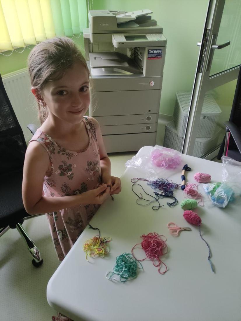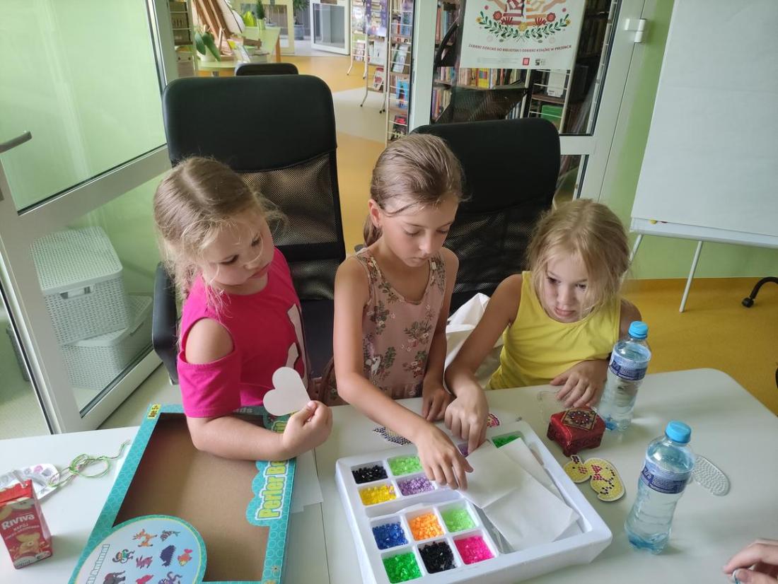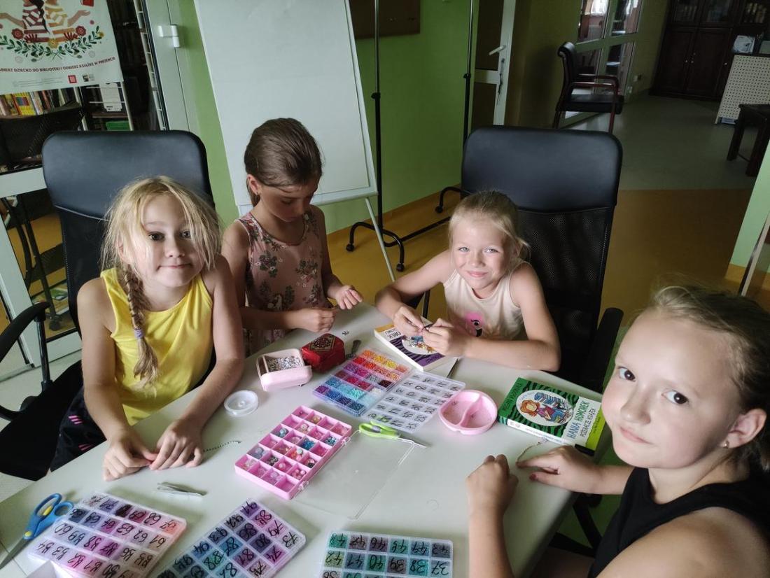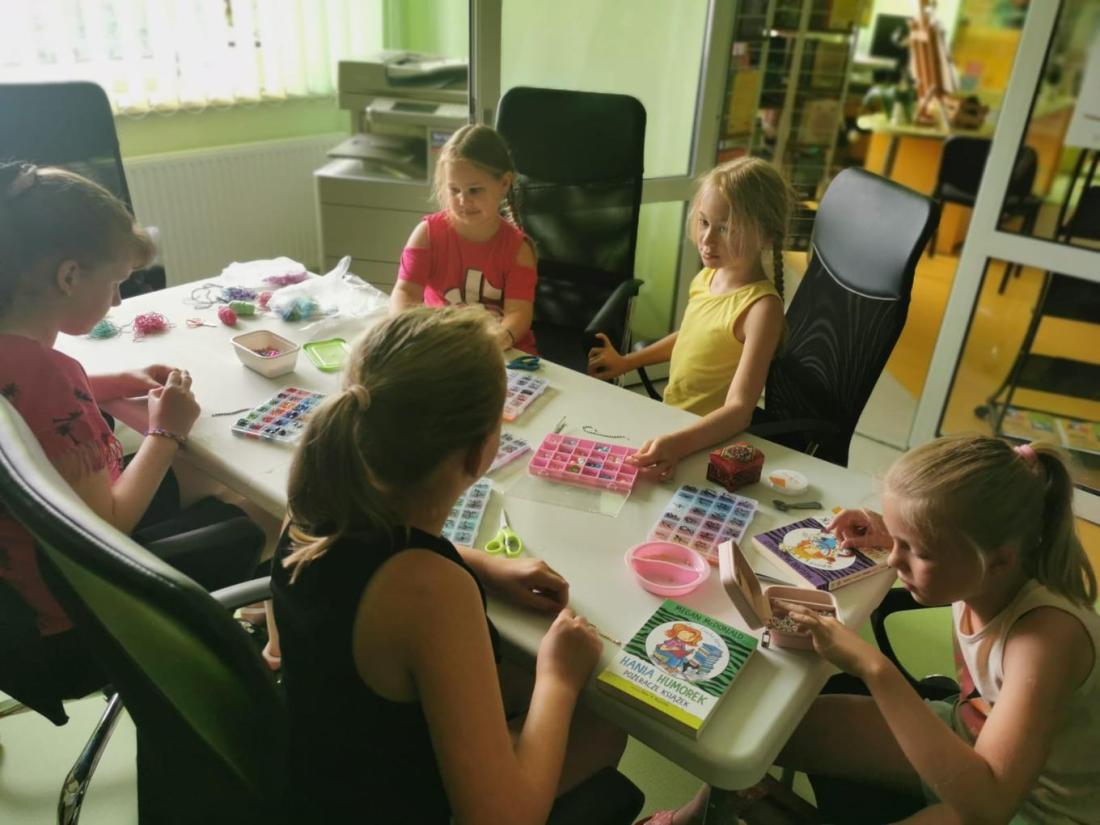 Podczas tych zajęć nasza biblioteka zamieniła się w prawdziwą pracownię biżuterii. Dzieci wykonały według własnego pomysłu i projektu cudne bransoletki i wisiorki. Nie brakowało im kreatywności – wykorzystywały koraliki, mulinę, gumeczki, sznurówki itp. Uczestnicy wspaniale razem współpracowali i pomagali sobie wzajemnie, co owocowało fantastycznymi pracami.