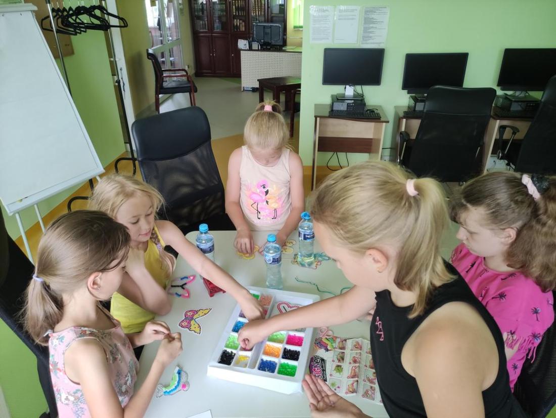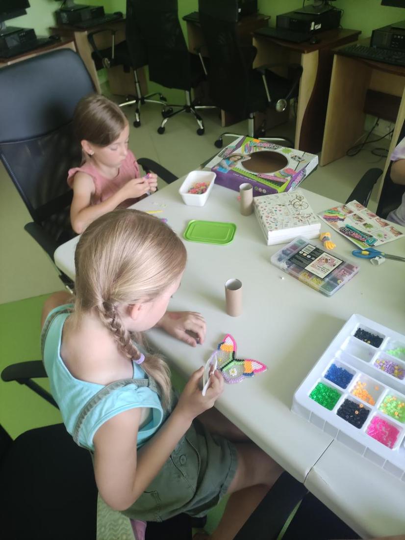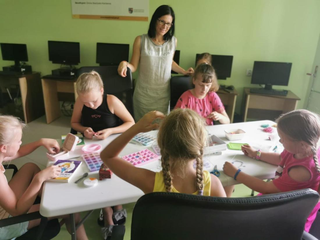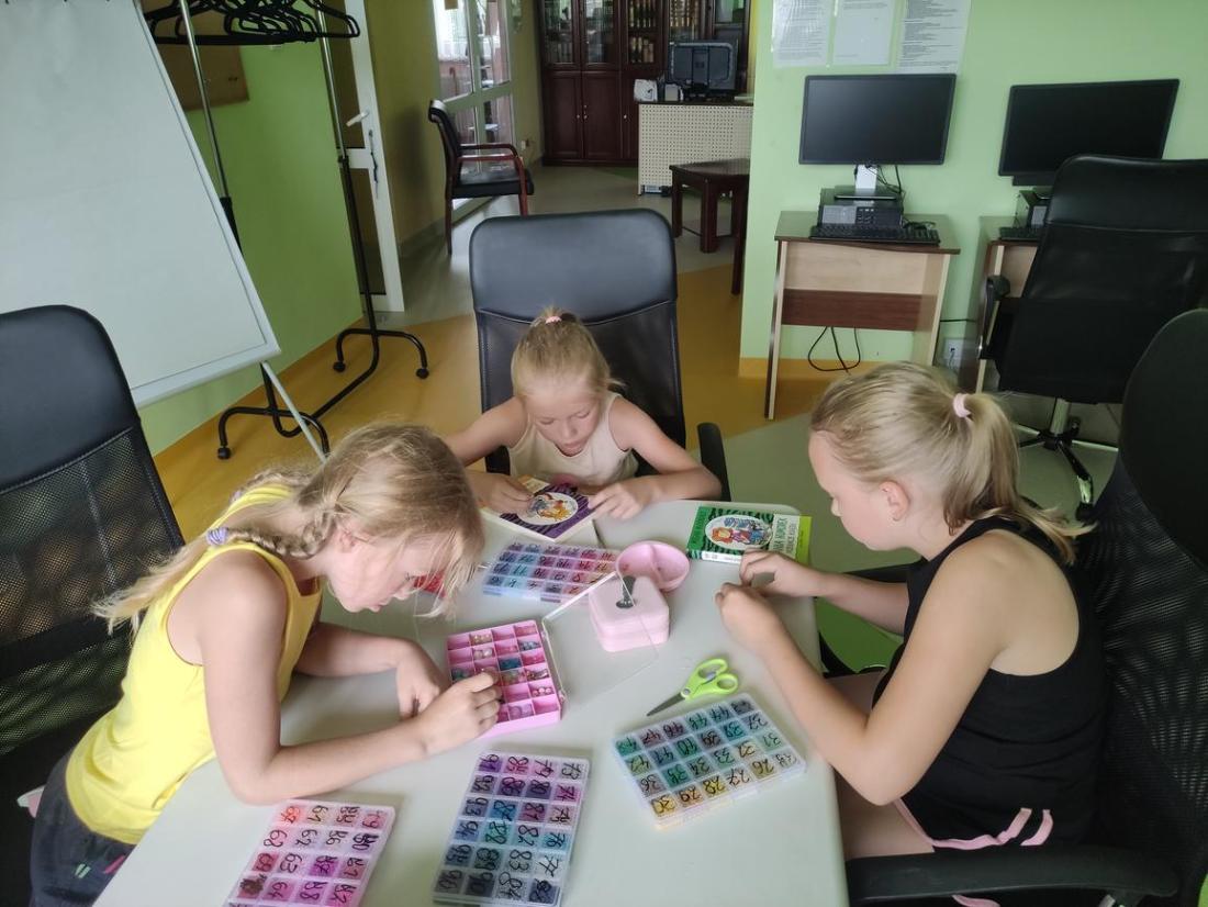 Podczas tych zajęć nasza biblioteka zamieniła się w prawdziwą pracownię biżuterii. Dzieci wykonały według własnego pomysłu i projektu cudne bransoletki i wisiorki. Nie brakowało im kreatywności – wykorzystywały koraliki, mulinę, gumeczki, sznurówki itp. Uczestnicy wspaniale razem współpracowali i pomagali sobie wzajemnie, co owocowało fantastycznymi pracami.