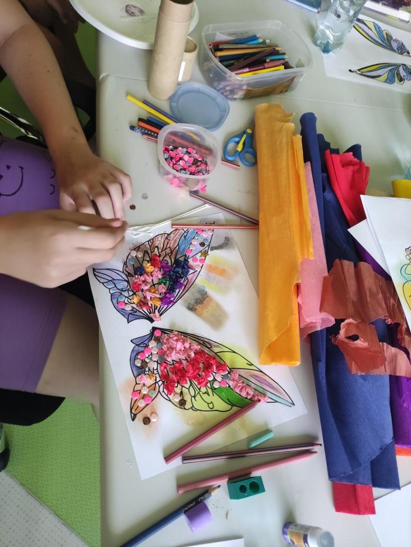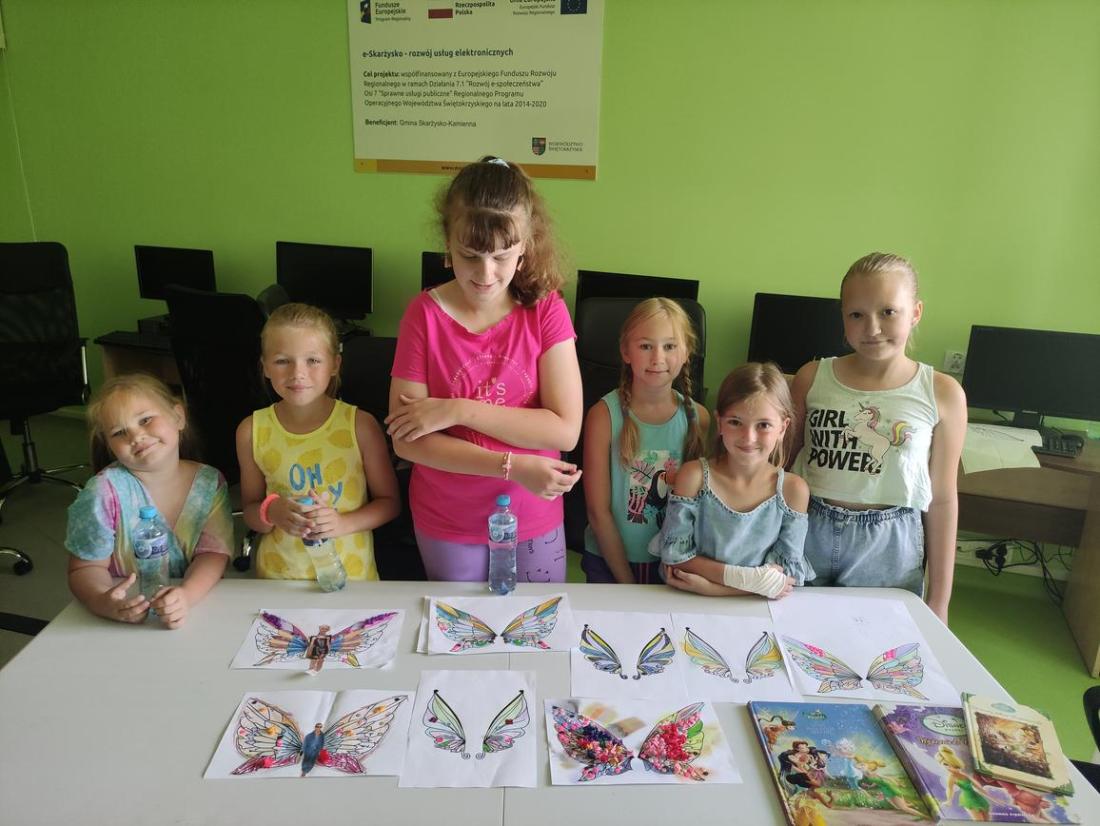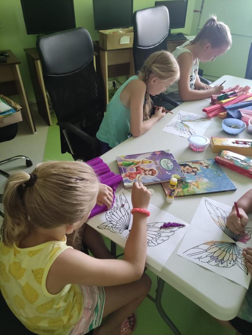 Tego dnia w bibliotece było magicznie i kolorowo. Oglądaliśmy książeczki o przygodach wróżek – ulubienicą okazał się oczywiście Dzwoneczek. To właśnie w oparciu o jej przygody zostały wykonane prace plastyczne. Dzieci miały za zadanie zrobić magiczne skrzydełka wróżki – poradziły sobie znakomicie. Ozdobiły je cekinami, kolorową bibułą i plasteliną.
