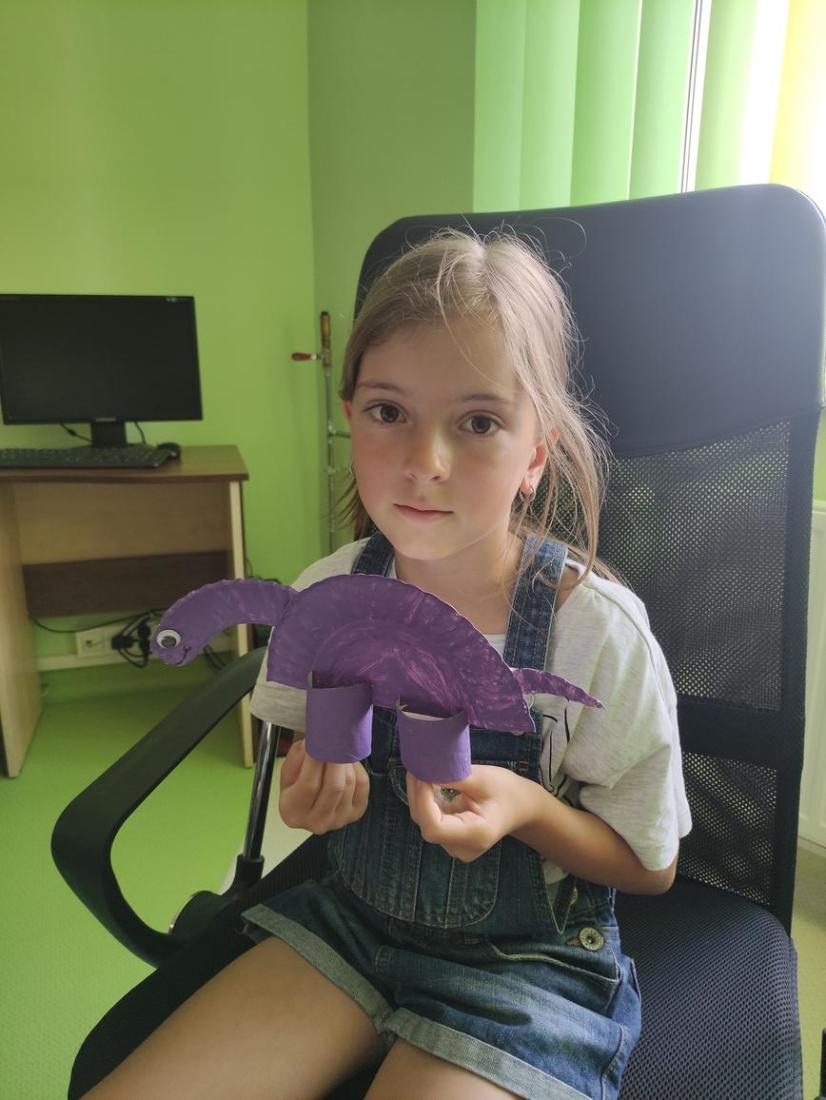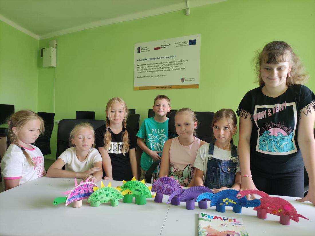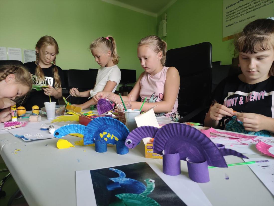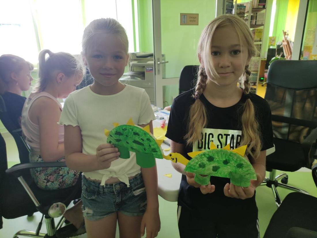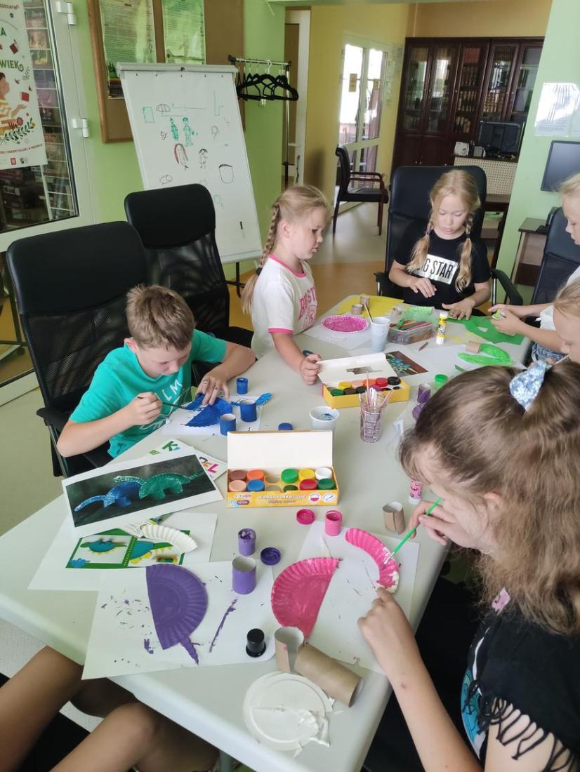 Uczestnicy zajęć zainspirowani tematyką wykonali z talerzyków papierowych postacie dinozaurów, które następnie pomalowali farbami i ozdobili plasteliną, cekinami i papierami kolorowymi.