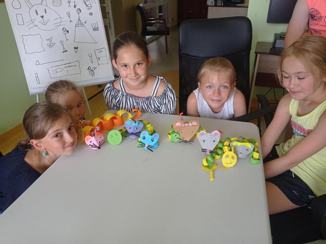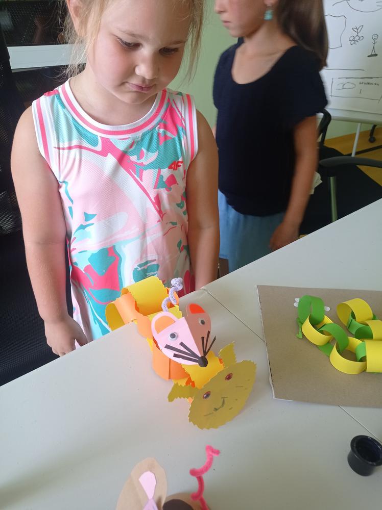 „Maluję, zgaduję, poznaję” – uczestnikom zajęć wystarczyły nożyczki, papier kolorowy, klej oraz niezawodna dziecięca wyobraźnia żeby powstały kolorowe, cieszące oczy myszki oraz węże. Kończąc zajęcia mogliśmy podziwiać efekty naszej pracy.