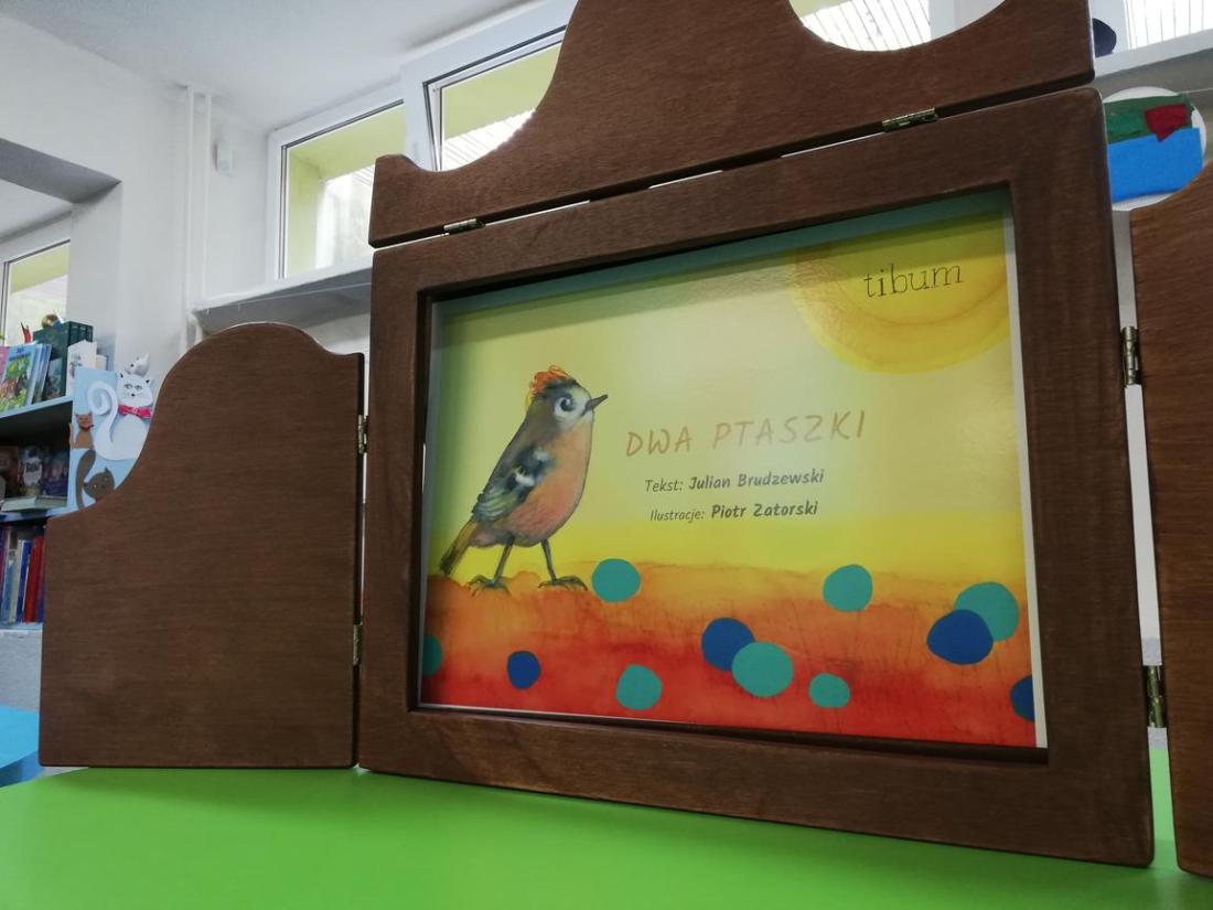 Na pierwszym spotkaniu Teatrzyku Kamishibai wystawiana była bajka „Dwa ptaszki”. Dzieci słuchały z zainteresowaniem jak mądry ptaszek znalazł sposób, by pić wodę ze szklanki. Następnie uczestnicy zajęć mieli okazję stworzyć własną bajkę do teatrzyku. Wybraną historią było „Krzesiwo”. Udało się przygotować niemal połowę ilustracji! Co jest niezwykłym osiągnięciem, biorąc pod uwagę niewielką liczebność grupy.