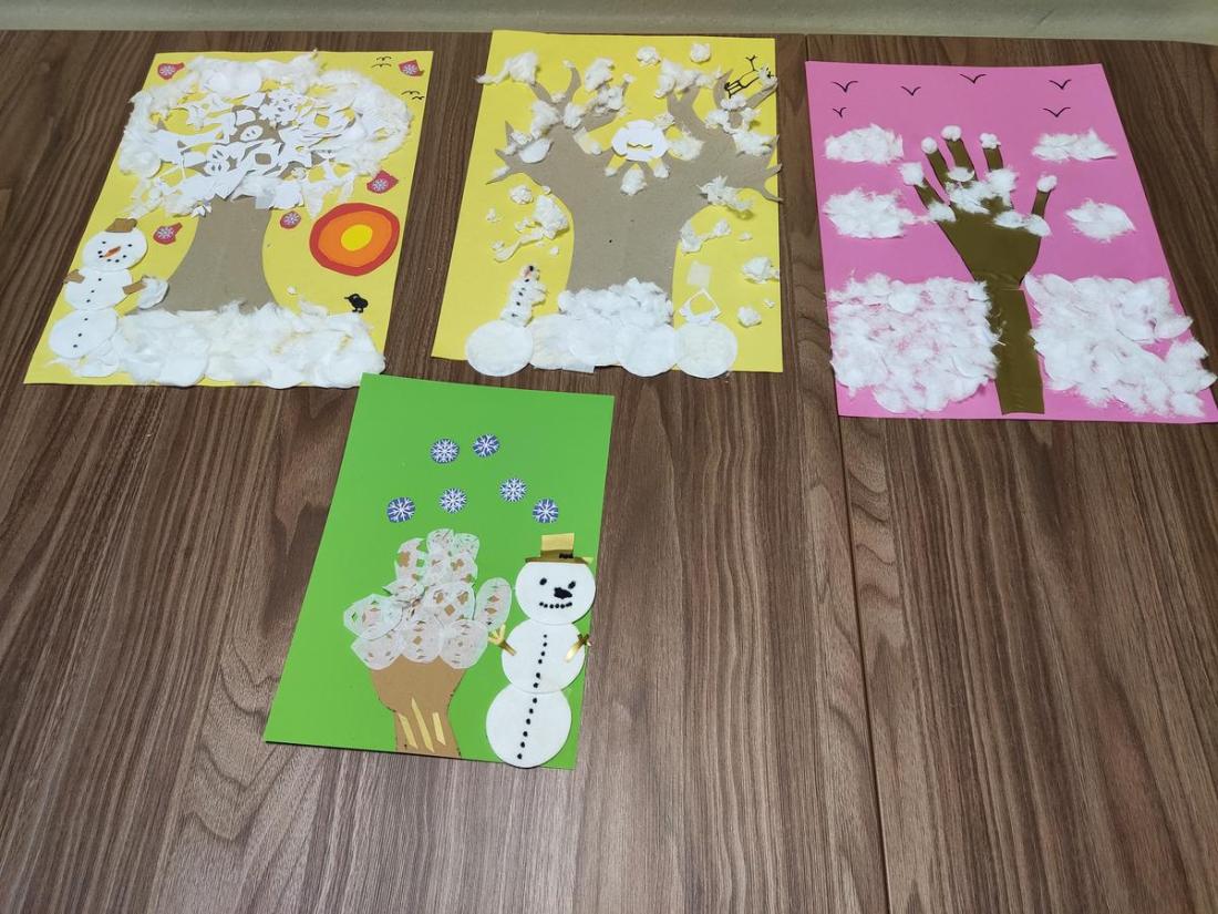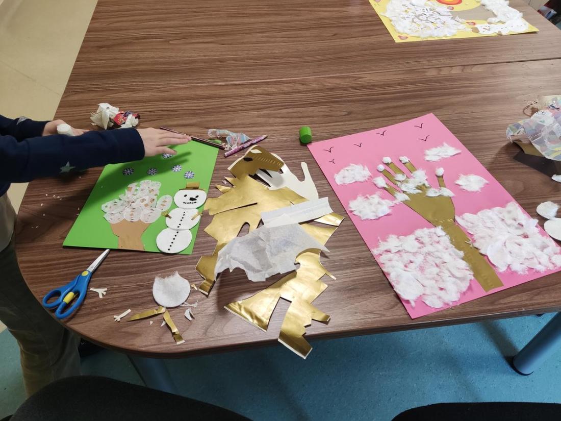 „Zasypani śniegiem”– to zajęcia plastyczne, na których wykonywaliśmy zimowe drzewa. Takie zimowe drzewa, bez liści, oprószone śniegiem wyglądają pięknie.