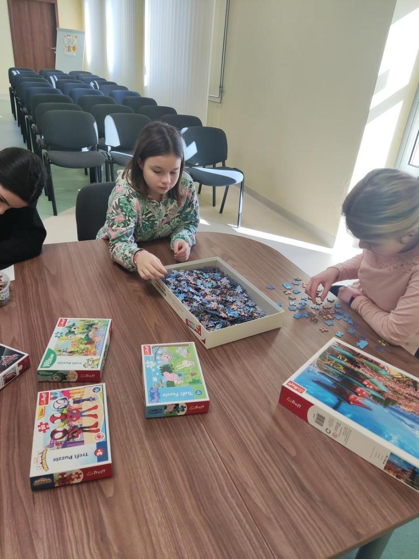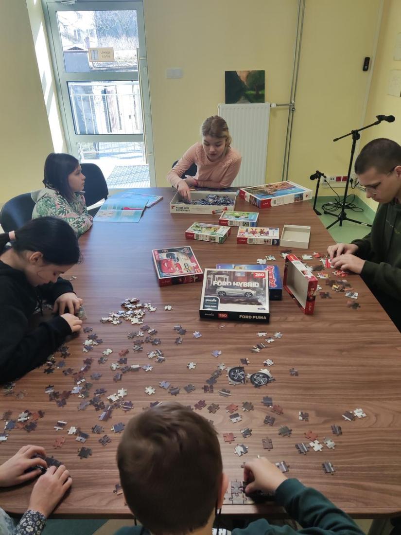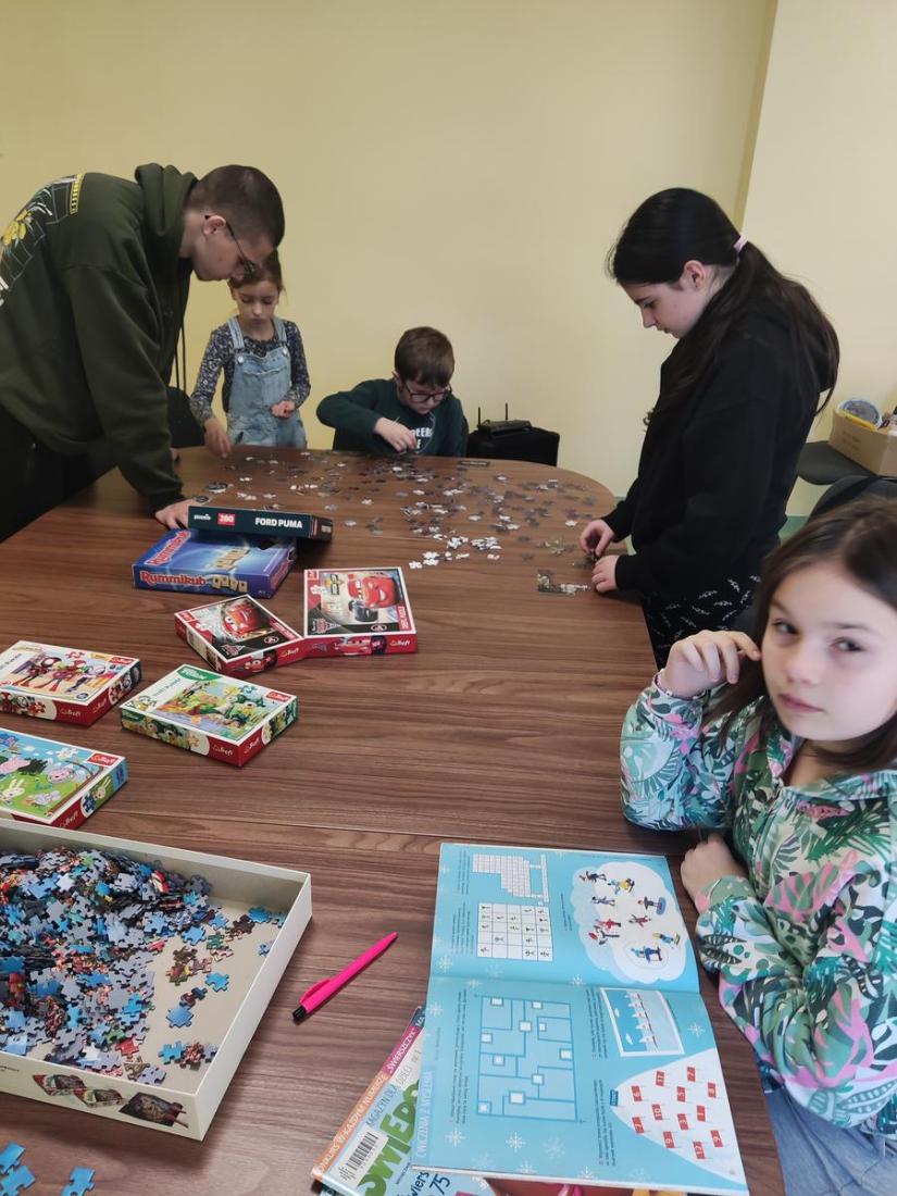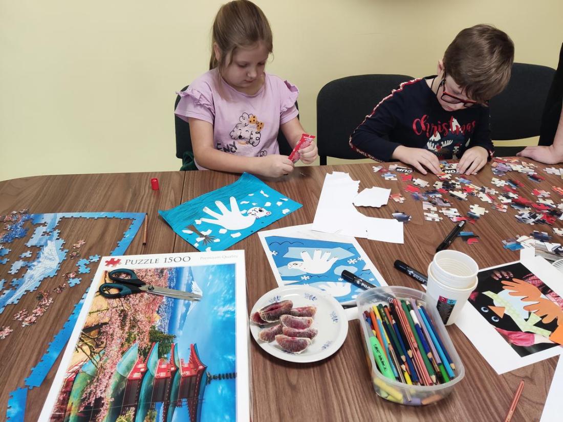 „O tym, czego nie znajdziecie w cyfrowym świecie” – 29 stycznia to Międzynarodowy Dzień Puzzli, dzień ten ma zwrócić uwagę na pozytywny wpływ puzzli na nasz mózg. Łamigłówki świetnie rozwijają koncentrację oraz stymulują obszary odpowiedzialne w umyśle za logiczne myślenie. Dlatego na naszych zajęciach, w tym dniu nie zbrakło małych, lubianych przez wszystkich kolorowych kartoników. Na zajęciach „Zaczarowana zima” z kolorowego papieru wykonywaliśmy zwierzęta, które kojarzą nam się z zimą. Opowiadaliśmy o tym gdzie spędzają zimę, jak nazywają się ich mieszkania,w jaki sposób szykują się do zimy oraz jaką część świata zamieszkują. Na ten temat dzieci wykazały się dużą wiedzą. Wszystkim, którzy wybrali bibliotekę na czas ferii serdecznie dziękujemy i zapraszamy w przyszłym roku.