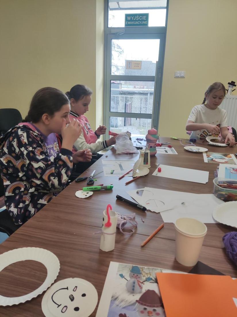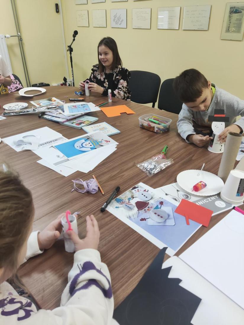 Na zajęciach „O tym, czego nie znajdziecie w cyfrowym świecie” w ruch poszły nożyczki, klej, kolorowy papier, kredki, flamastry oraz wiele innych przyborów papierniczych i powstała prześliczna rodzina bałwanków.