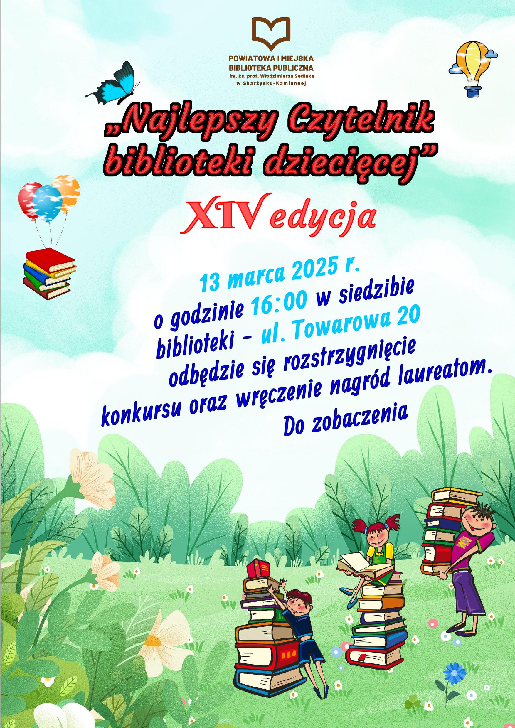 Rozwiązanie konkursu „Najlepszy Czytelnik biblioteki dziecięcej” – XIV edycja – zaproszenie Post published:4 marca 2025 Post category:archiwum / Dla dzieci / Komunikaty / Konkursy / Wydarzenia 13 marca 2025 r. o godzinie 16:00 w siedzibie biblioteki – ul. Towarowa 20 odbędzie się rozstrzygnięcie konkursu oraz wręczenie nagród laureatom. Read more articles Previous PostHotelowe Piosenki – Trasa koncertowa Pawła Domagały. Następny wpisZapomniane na śmierć | Nora Roberts