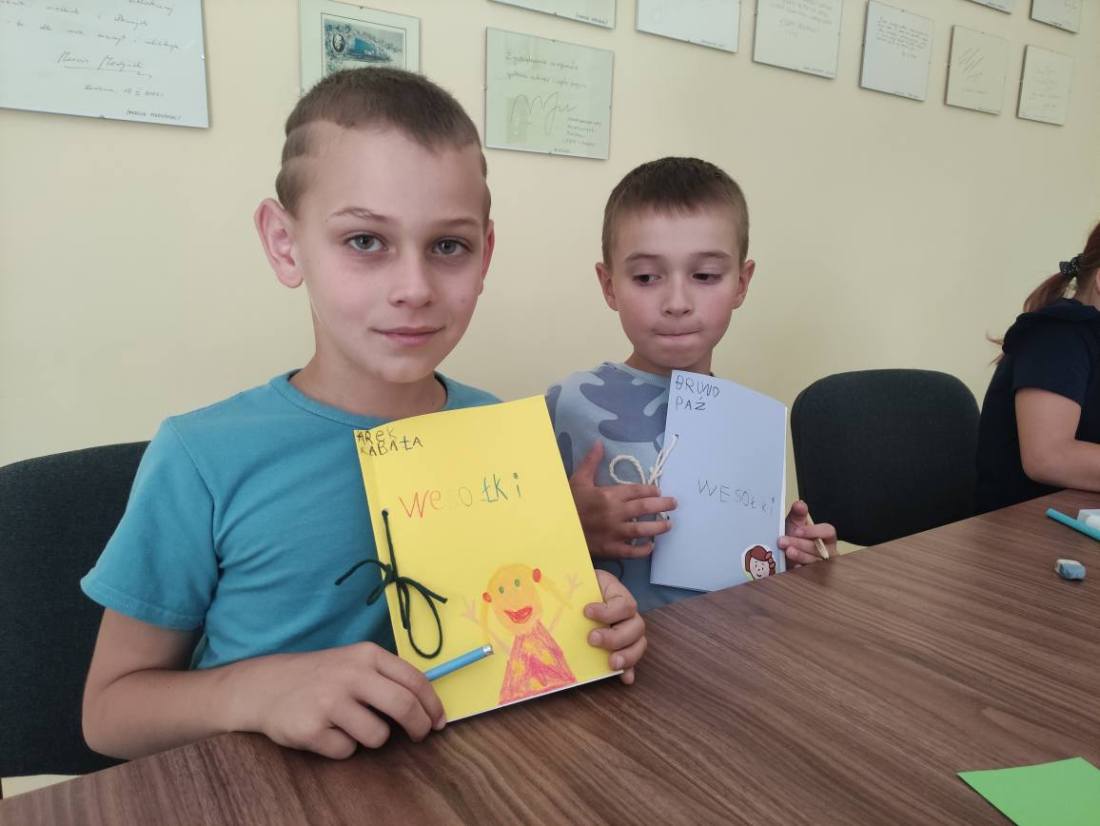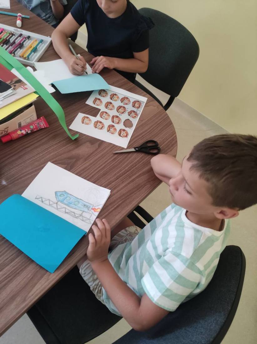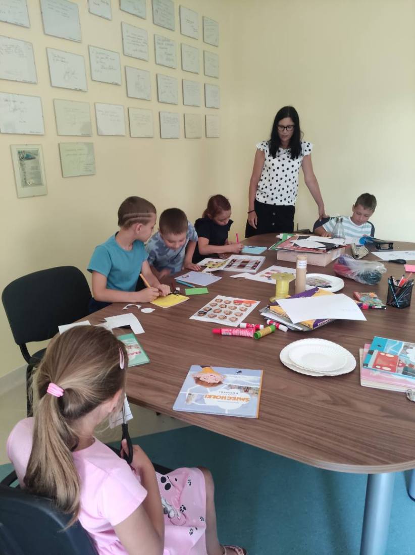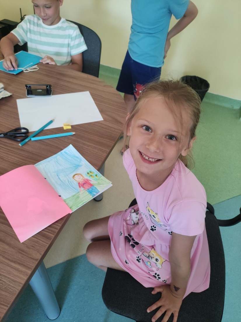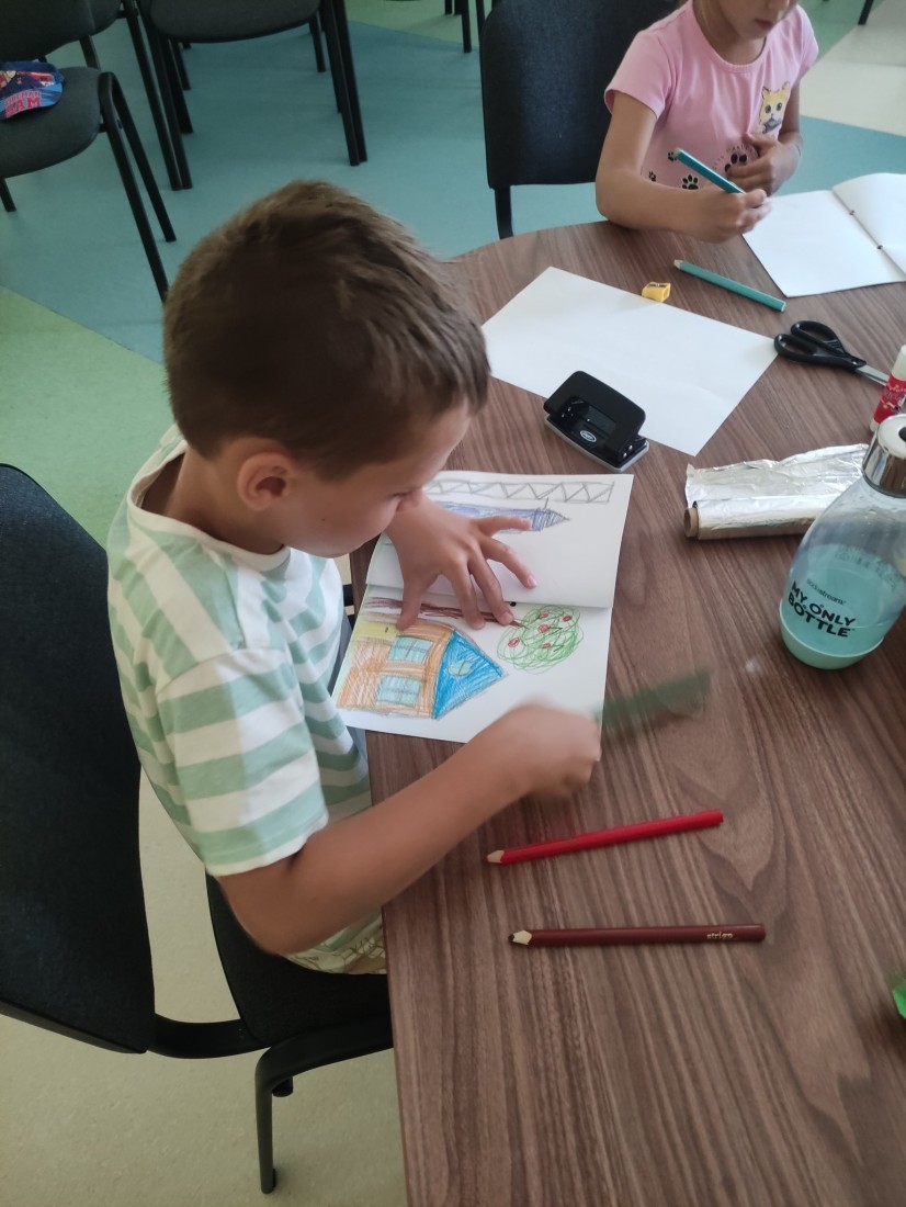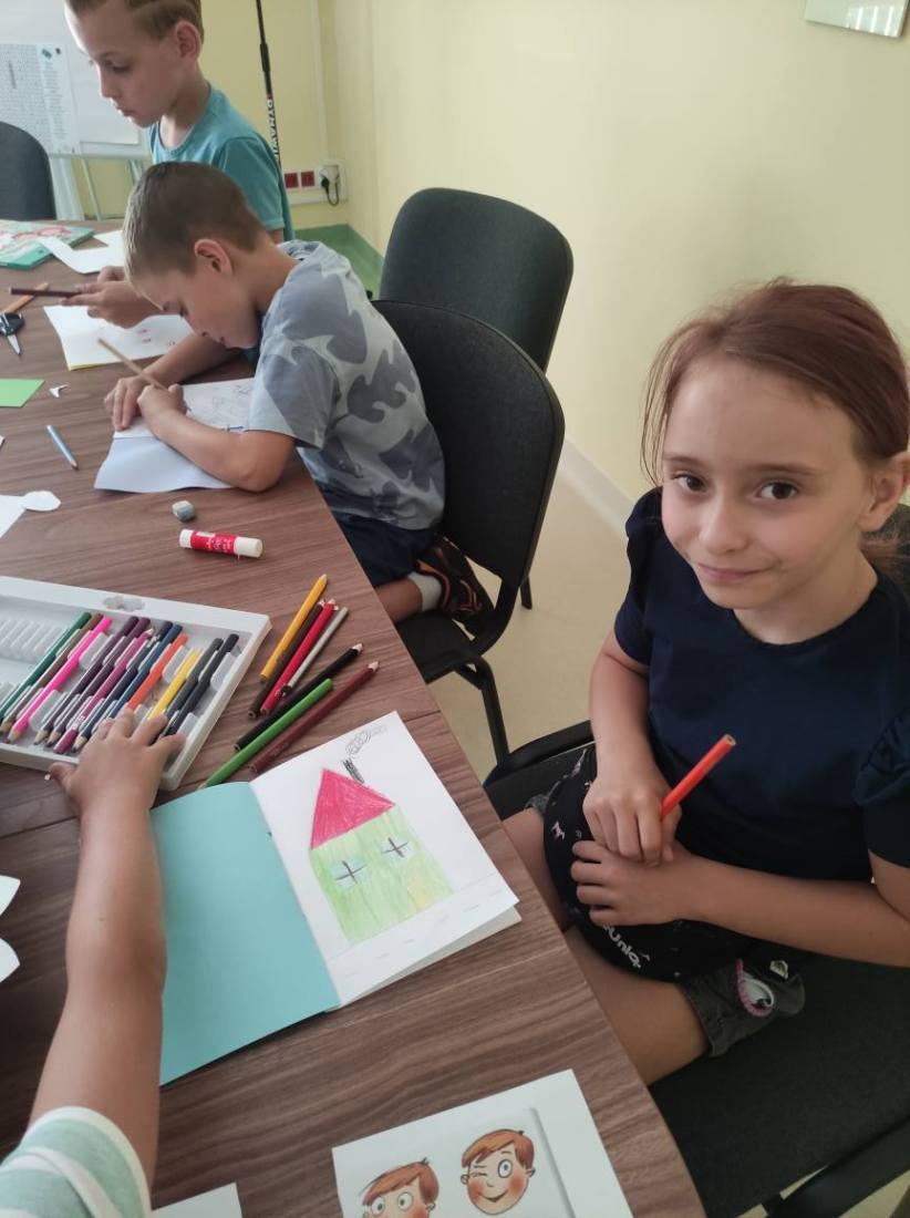 15.07.2025 r. w bibliotece przy ul. Towarowej odbyły się kolejne wakacyjne zajęcia z cyklu Miasteczko Humorki. Dzieci z zainteresowaniem wysłuchały opowiadania pt. „Kłamczusiaki” Agnieszki Zimnowodzkiej. Rozmawialiśmy o emocjach i cechach, które mogą charakteryzować ludzi. Uczestnicy mieli za zadanie wymyślić rodzinkę i stworzyć własną książkę na jej temat i tak powstały książki o Wesołkach i Kosmonautach, w których znalazły się ilustracje miasta Humorki, domki jego nowych mieszkańców oraz bohaterowie narysowani zgodnie z ich szczególnymi typami charakteru.